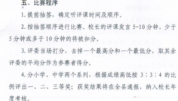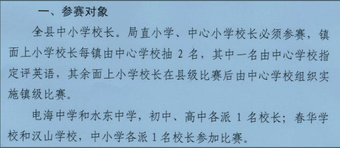 现在每个镇只能有三五位校长参加县级的比赛,范围太小了。如果全县所有校长都能有机会参与,那就太好了。