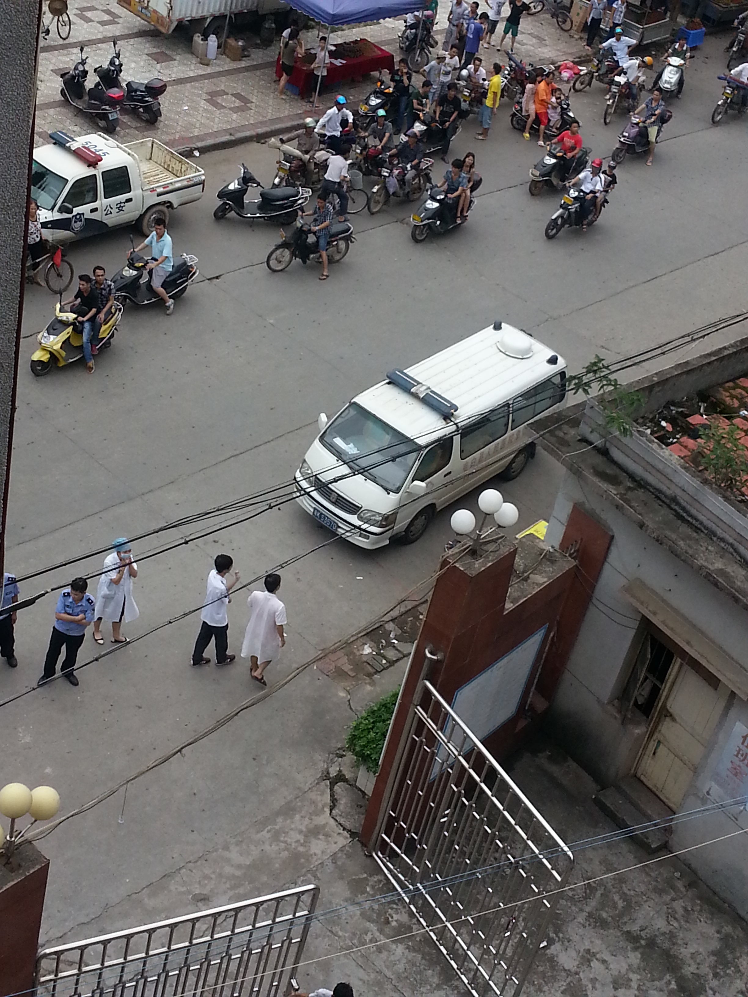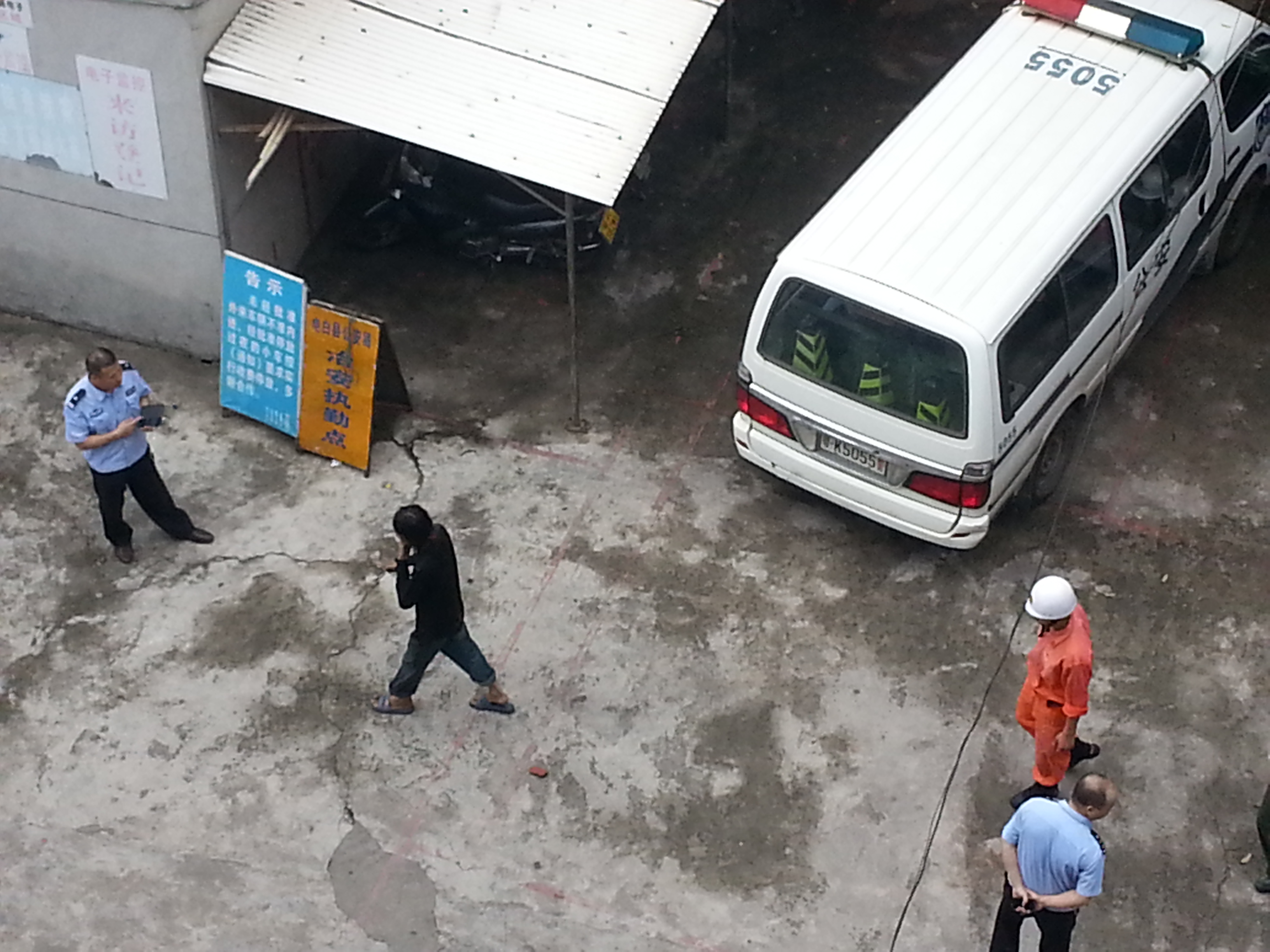 今天中午1时半,一疯子跑到财政所楼顶,一会坐在栏杆上,一会拿砖头向楼下乱丢,门卫报警,几分钟来了10多名警察,一会又来了几位消防人员,也来了救护车。各部门反应及时,先赞一个。