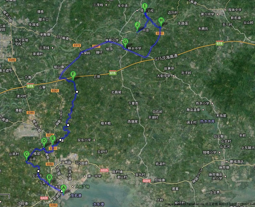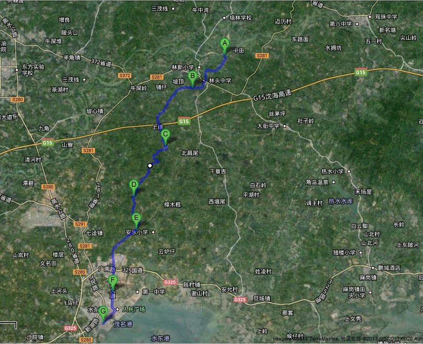7月6日星期六早上8:40-9:00在海尾牌坊集合(地图B点,即水东新湖二路与325国道汇合处),9:00准时出发;