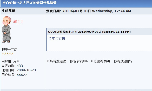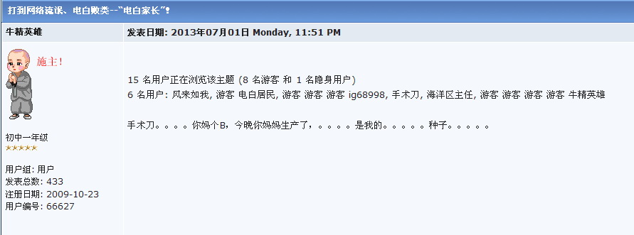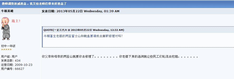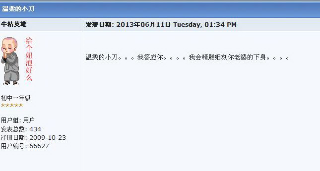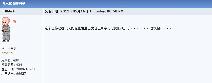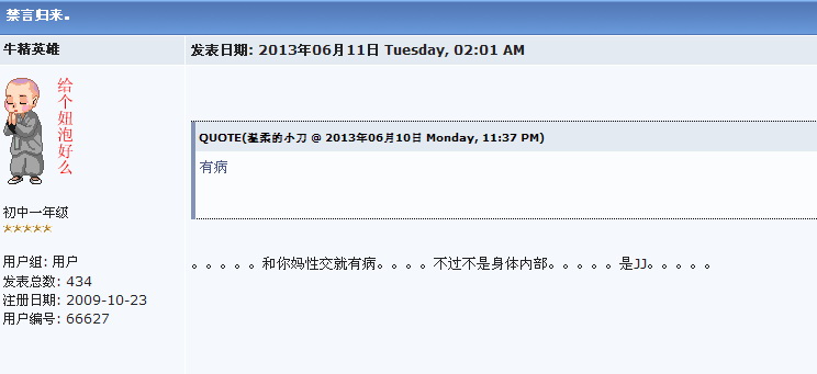 绿 绿色长城 大学三年级 注册 2006-03-07 消息 891 反馈评分 1 点数 1 2013-08-15 #19 远程南瓜锤竟发八九年那件事情的图片,真是哪壶不开提哪壶,你脑子是用什么什么的?是狗屎做的吗? 你这个资深五毛,这头真的不知道怎么说你,领五毛领得头晕了还是你本身就有神经病?