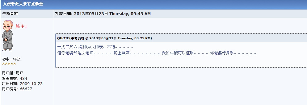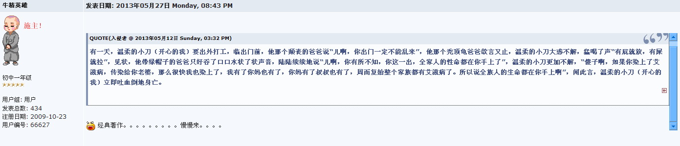 QUOTE(牛精英雄 @ 2013年08月16日 Friday, 11:08 PM) 这个豆腐脑南瓜,他是红党一脉相承的生产物,都有一个特点:台上道貌岸然、富丽堂皇,台下却是偷鸡摸狗、臭气熏天。 说的是,南瓜经常自榜为思想高尚,自视为党的代言人,但却经常发些黄色咸湿的露屁股图片污染环境。 [snapback]3574282[/snapback] 哦,原来是你啊。你的马甲也忒多了点。看看这位君子是如何引领论坛道德风尚的。