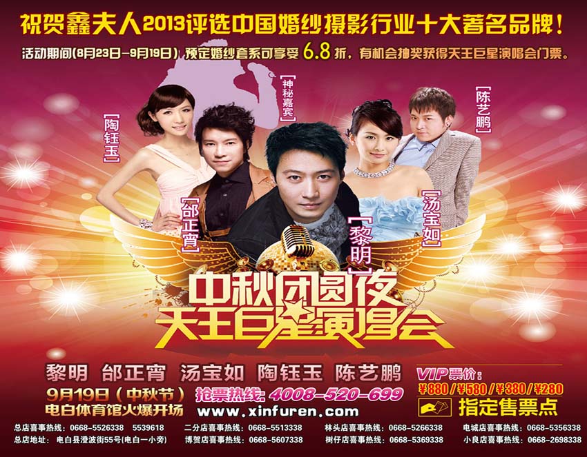 卖票啦,为了祝贺鑫夫人2013评选中国婚纱摄影行业十大著名品牌!邀请天王巨星(黎明)汤宝如、邰正宵、陶钰玉、陈艺朋等明星9月19号晚8:00电白体育馆与你贺中秋。现在为回馈广大用户的支持,鑫夫人婚纱摄影在汇景广场搭棚卖门票啦,大家要买的话要赶快哦! 地点:汇景广场门口 时间:2013.9.9-2013.9.18(早上12点到晚上10点) [attachmentid=317358]