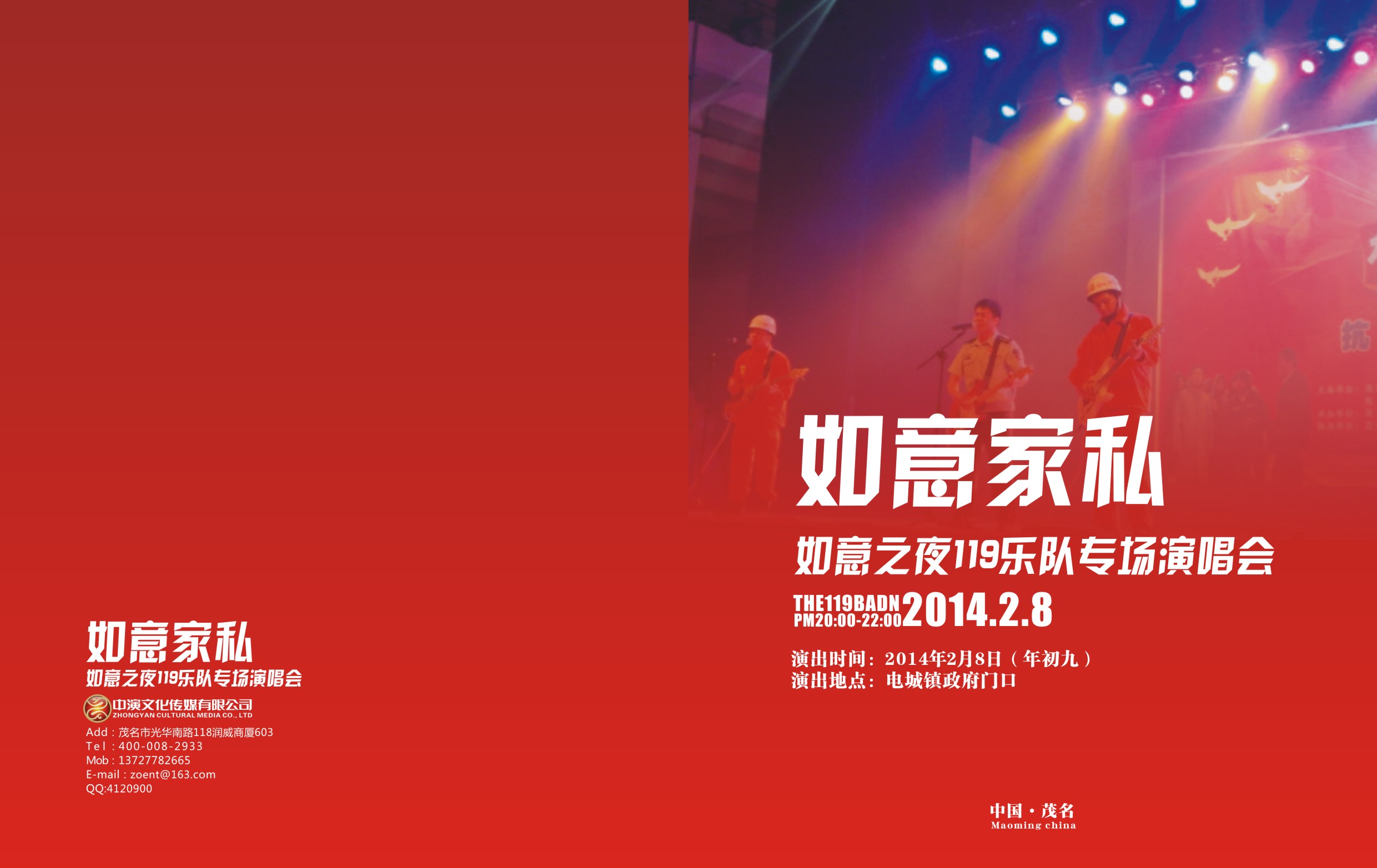 滨海新区新春钜献:如意之夜119乐队演唱会即将怒放! 由茂名市流行音乐协会承办,特邀国内首支发行专辑的军旅原创组合119乐队,汇聚茂名音乐精英,用青春、激情首次在滨海新区掀起一次音乐革命。演出使用国内顶级音响器材,全程大乐队伴奏,欢迎免费观看。 时间:大年初九晚上7:30―10:00 地点:电城镇政府门口大广场