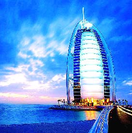 布尔吉・阿勒阿拉伯酒店建于1999年。酒店建在位于紧靠迪拜海岸的一座人造岛屿上。酒店外型像一艘行驶中的帆船。套房都是复式结构,上层是主人房,下层供客人使用。主卫里有按摩浴缸。房客如果想去逛商场,酒店有免费巴士接送。酒店的早餐价格为41美元。