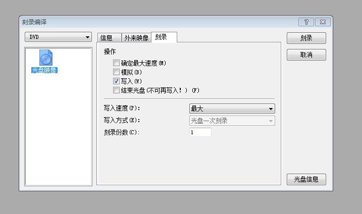 2,下载NERO中文版刻录软件,这是一款功能极其强大的刻录软件(除了可以刻录系统碟,还可以用来刻录可以在电脑或车上播放的CD或DVD歌曲碟,文件数据碟等等)。安装完成,打开里面的子软件“nero Burning rom”,在上面的菜单里点击“刻录器”,下拉子菜单里选择“刻录映像文件”,打开你下载的操作系统iso文件,上面的“结束光盘(不可再写入)里面打上勾”,其它默认却可(若“写入方式”这里不是默认的“光盘一次性刻录”,请选择“一次性刻录”的方式。),后面就是等待刻录结束(根据写入速度的快慢,一般3至5分钟就可刻录完毕)。