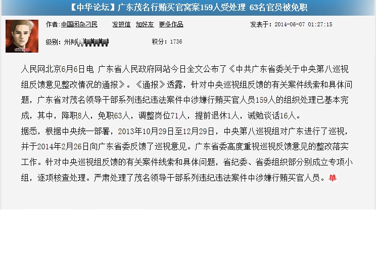 人民网BJ6月6日电 广东省人民政府网站今日全文公布了《ZG广东省委关于中央第八巡视组反馈意见整改情况的通报》。《通报》透露,针对中央巡视组反馈的有关案件线索和具体问题,广东省对茂名领导干部系列违纪违法案件中涉嫌行贿买官人员159人的组织处理已基本完成,其中,降职8人,免职63人,调整岗位71人,提前退休1人,诫勉谈话16人。