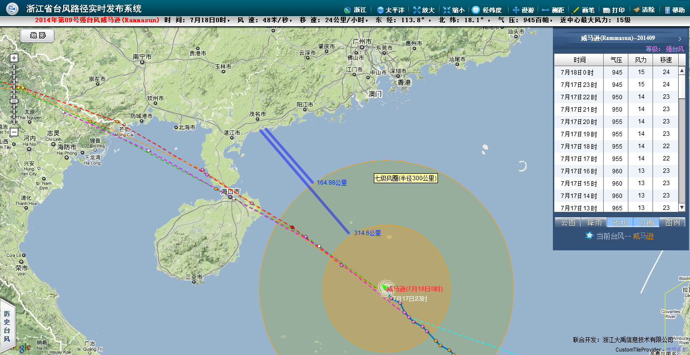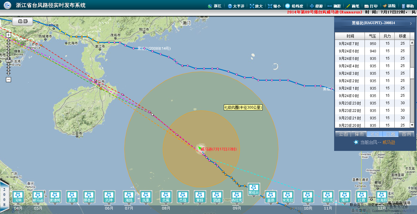 白色孔布 博士生 注册 2006-03-29 消息 1,226 反馈评分 1 点数 61 2014-07-17 #39 2008年“黑格比”与今年“威马逊”路线对比图: [attachmentid=330106] 附件 浙江省台风路径实时发布系统.png 516.5 KB · 查看: 450