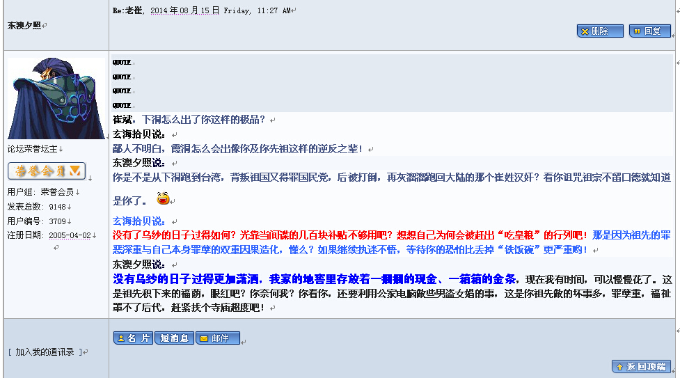 玄海拾贝 教授 注册 2010-07-14 消息 3,523 反馈评分 2 点数 61 2014-08-22 #2 东澳夕照说: “没有乌纱的日子过得更加潇洒,我家的地窖里存放着一捆捆的现金、一箱箱的金条,现在我有时间,可以慢慢花了。这是祖先积下来的福荫,眼红吧?你奈何我?你看你,还要利用公家电脑做些男盗女娼的事,这是你祖先做的坏事多,罪孽重,福祉罩不了后代,赶紧找个寺庙超度吧!” 是不是这些招供出了问题?如果真的,那么再见了,“东澳夕照”!再见了!“可爱”的老乡!