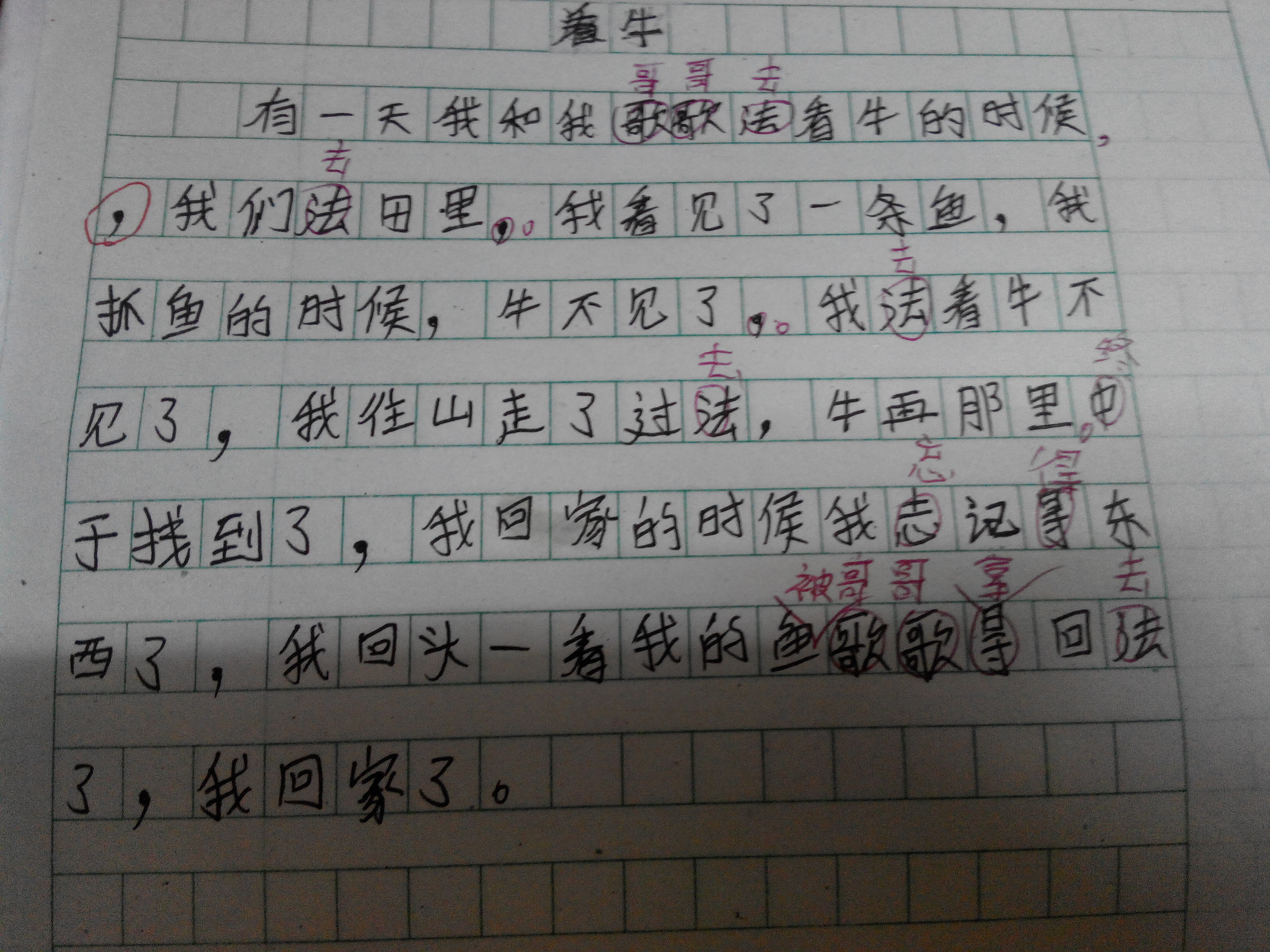 你与哥哥一起放牛,抓鱼都是生活中有趣的事。你能把它们记录下来,与同学们分享。老师鼓励你!