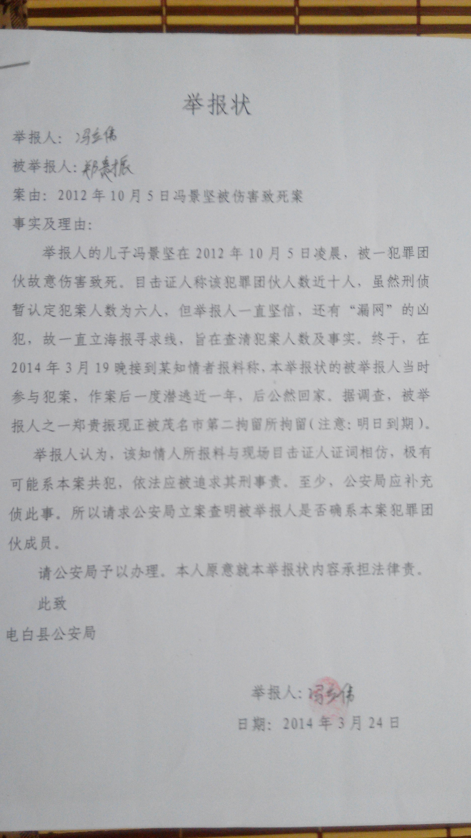 电白新新国际事情自2012年10月5日发生以来,受害人家属一直寻找证据,并多次举报公安局相关办案人员未追究参与作案的共犯陈启达及郑贵振参与新新国际事件犯罪事实包庇渎职行为!主犯吴玉鹏潜回电白寻求其老大帮忙逃亡的事实线索,公安局无所作为,特别是郑贵振在茂名看守所二所时,家属一直举报其参与新新国际事件的犯罪事实,让网上追逃犯再次逃离法律的制裁,有包庇凶手的嫌疑,希望相关领导及上部门严肃查处电白公安局黑警,不护短,还受害人一个公道,还社会一个公平正义!以下是事实证据:[attachmentid=333003]电白新新国际事件证据https://idianbai.com/index.php?showtopic=213114