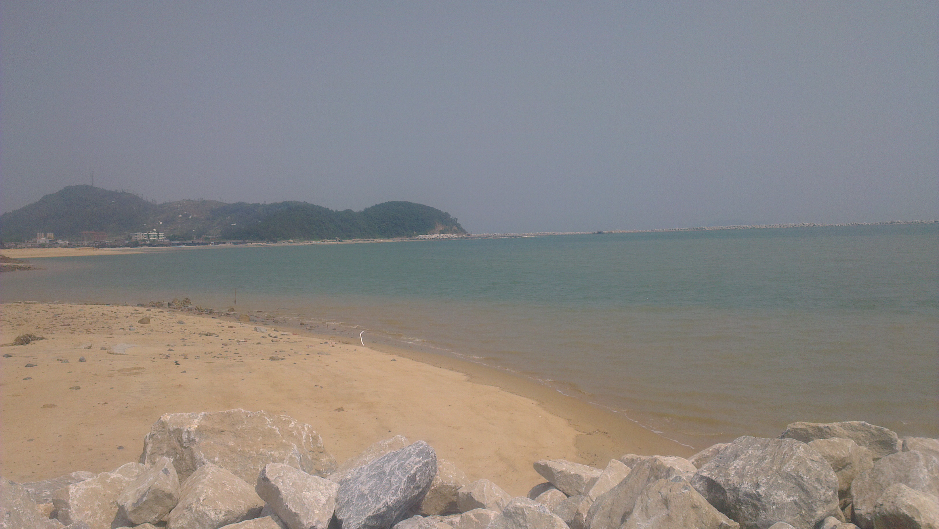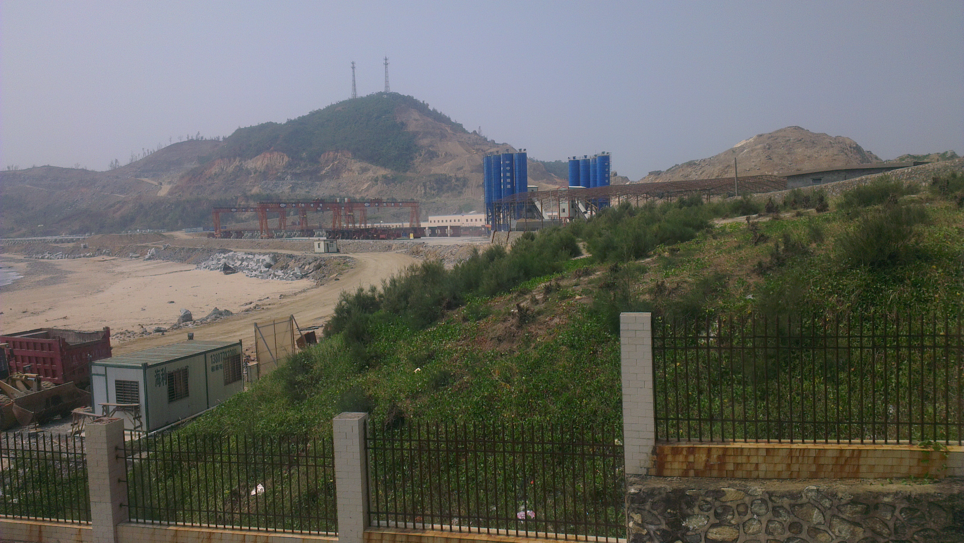 图中小山叫莲头岭,海拔250多米,两峰并峙状若莲花并蒂,位居电白县旧八景之二的“莲岭青屏”就是这两个小山。右边岭脚白色的是一道建设中的东防波堤,近处堆满石头处是西防波堤,两道防波堤延伸相接围起的海域将被填平,往后就是堆放煤炭等大宗货物的的码头