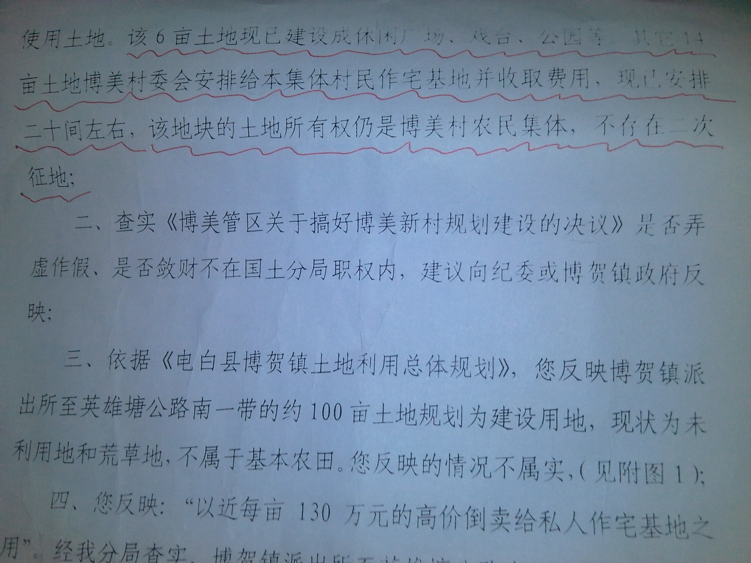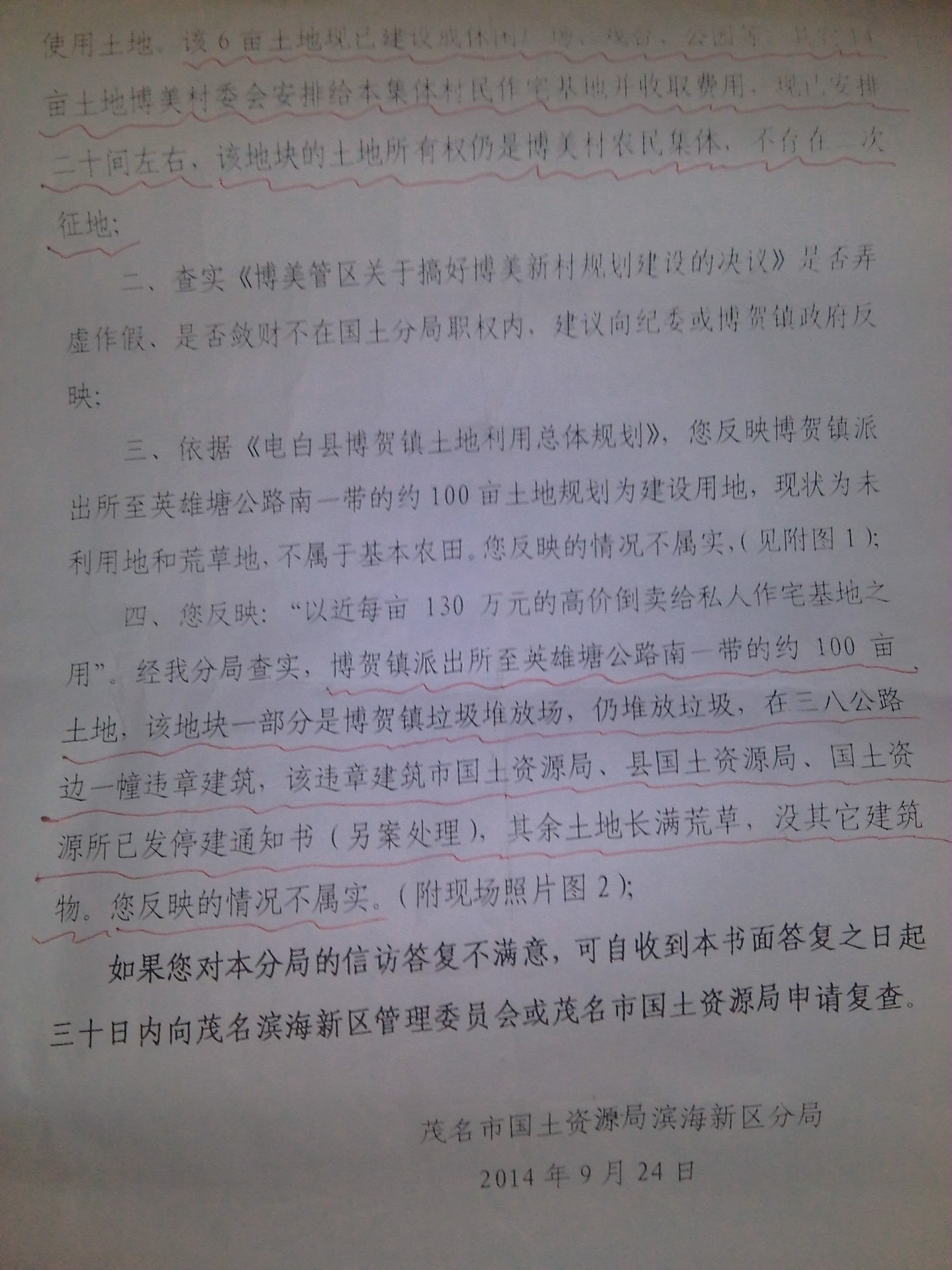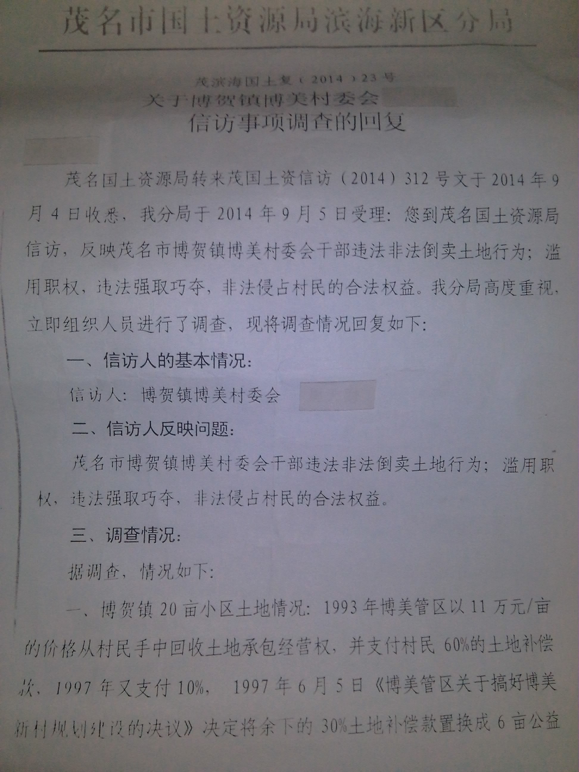 Z zhou 荣誉会员 荣誉会员 注册 2005-08-04 消息 2,293 反馈评分 5 点数 61 年龄 65 所在地 电白区 性别 男 2014-11-24 #1 茂名市滨海新区博贺镇博美村村民投诉博美村委会在翠湖西一片二三十亩土地未征先卖,茂名市国土局滨海新区分局于2014年9月24日对村民作出明确回复,该地确实未征用。但博美村委会干部却拿法律当戏儿,近日却在农民的耕种地插上了“此地已征用,请停止生产”的标签,在目前土地清查阶段,在法律法规健全的今天,这种行为真是荒唐至极…… 附件 IMG_20141117_135437.jpg 792.2 KB · 查看: 293 IMG_20141117_135526.jpg 821.3 KB · 查看: 231 IMG_20141117_135635.jpg 829.5 KB · 查看: 213