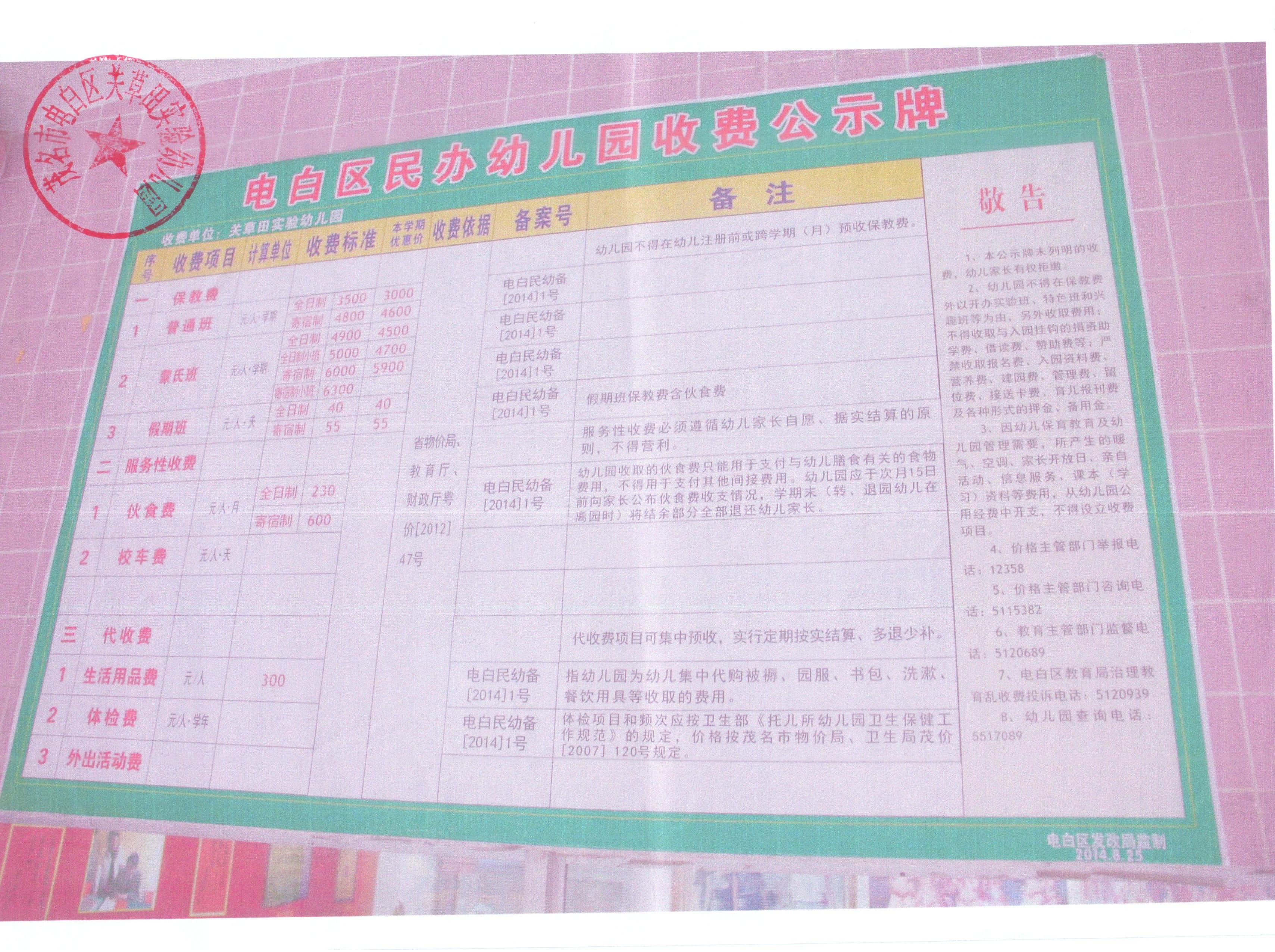 目前,电白区关草田实验幼儿园依法依规办园,依法依规收费。根据《广东省物价局、广东省教育厅、广东省财政厅关于〈幼儿园收费管理暂行办法〉的实施细则》和《广东省物价局、广东省教育厅、广东省财政厅关于民办幼儿园收费备案的实施细则》的通知(粤价【2012】47号)第五条规定:民办幼儿园实行备案制管理。电白区关草田实验幼儿园2013年收费备案号为:【电白民幼备【2013】1号】;2014年收费备案号为【电白民幼备【2014】1号】。对以上备案依规进行了公示,没有任何强行收费、乱收费行为。