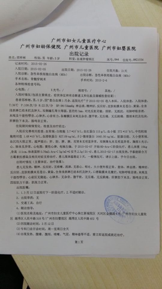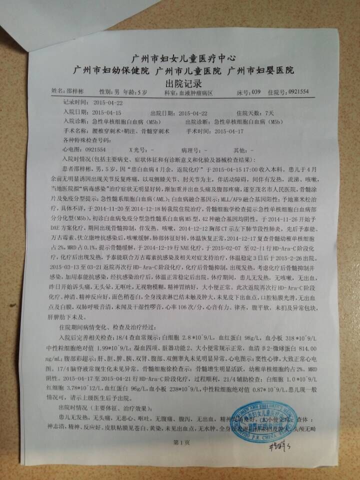 官盖满电白 高中二年级 注册 2009-07-06 消息 607 反馈评分 0 点数 1 2015-04-26 #67 小朋友第5个疗程治疗已经出院了,下面是出院记录 附件 出院记录.jpg 107 KB · 查看: 303