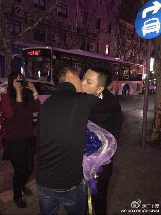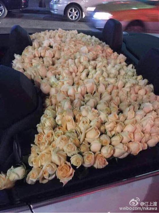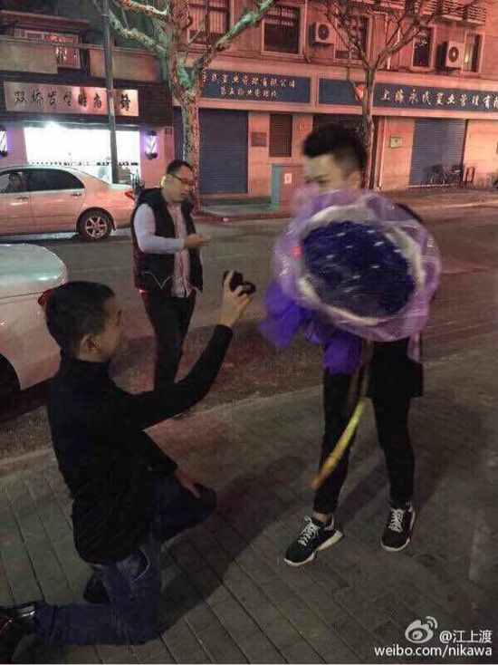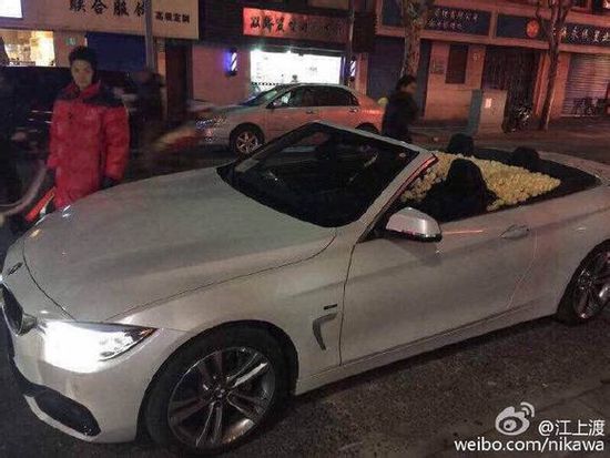 网易汽车综合1月25日报道 昨晚11点40分许,有网友围脖上传照片称,上海太仓路惊现男男求婚。一男子开宝马敞篷车满载整车鲜花,单膝跪地向另一男子求婚,求婚成功后两人当街拥吻。