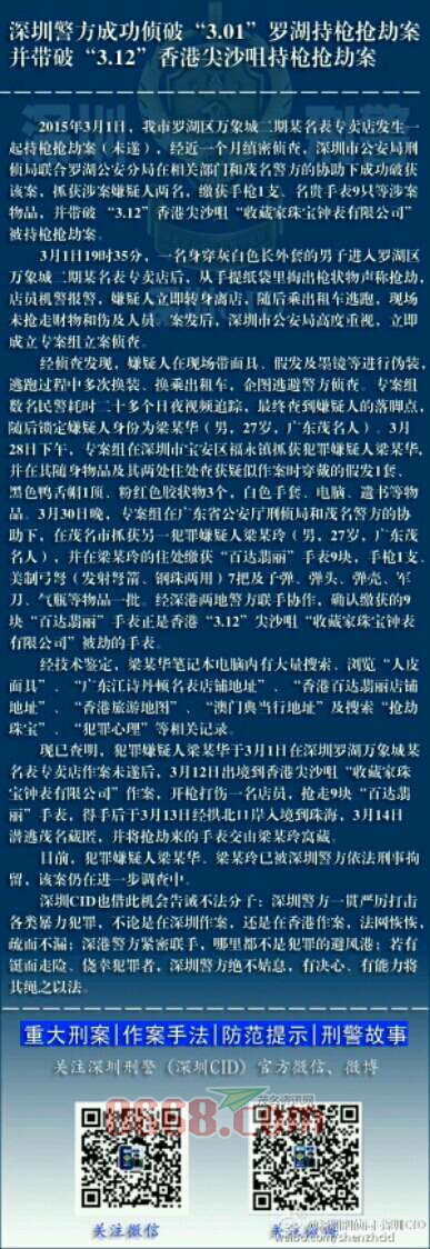 3月1日,深圳市罗湖区万象城二期某名表专卖店发生一起持枪抢劫案(未遂),近日,@深圳刑侦局-深圳CID 联合@深圳罗湖公安 成功破获该案,抓获涉案嫌疑人两名,缴获手枪1支、名贵手表9只等涉案物品,并带破 “3.12”香港尖沙咀“收藏家珠宝钟表有限公司”被持枪抢劫案。转自深圳刑侦