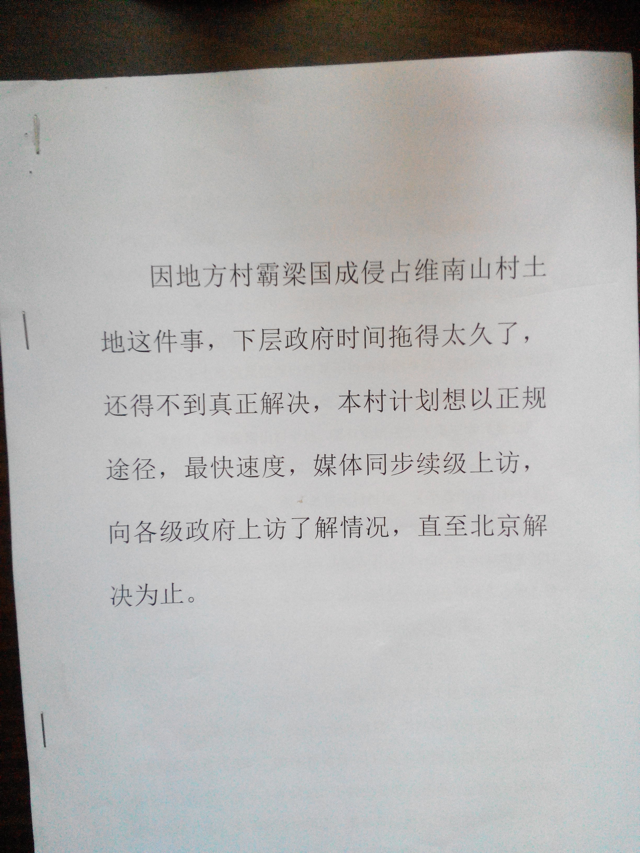 维南山村示:在20015年9月8曰梁国成地方村霸带头扇动群众到维南山村闹事,打伤村民梁华桥,称其岭土归他所有。