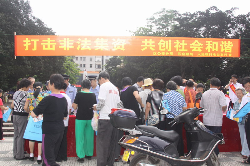 为深入推进省公安厅“3+2”专项打击整治行动,切实加大打击非法集资专项宣传工作力度,4月28日上午,电白区公安分局联合区金融局、人民银行电白支行等相关部门在水东镇东湖公园门口举行以“打击非法集资、共创社会和谐”为主题的宣传活动。