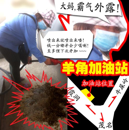 羊角加油站:今天下午三点多,我到羊角加油站加油,一位打扮得跟车臣黑寡妇似的大妈接待了我,她一拿起加油枪就往我油箱上注,我就问她:“回零了吗?”她说:“不回零怎么给你加油?”话音未落,哗啦啦……井喷哇!!!一大坨油往外飙~~~ 我说:“阿姨,这怎么回事啊!喷出来了哇!!”她说:“喷就喷喽!你没见过它喷咩?”我笑着说:“那就要打折了哇“-)她却说:“钱一分也不会少,最多是你下次不来了!”我擦,她一点幽默感也没有…… 我拍摄了张照片,然后如数地给了钱开车走了,她仍在车后骂骂咧咧的,隐约听到:“没钱就不要加油嘛~ 那么吝啬……”