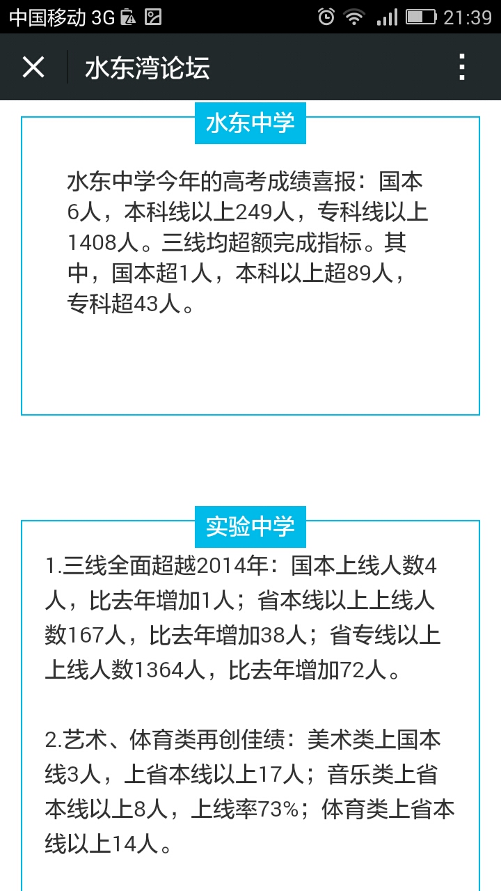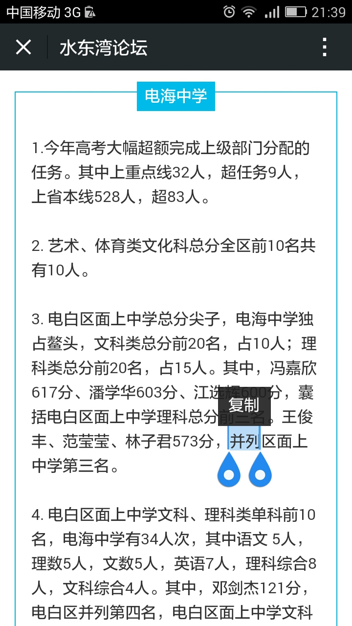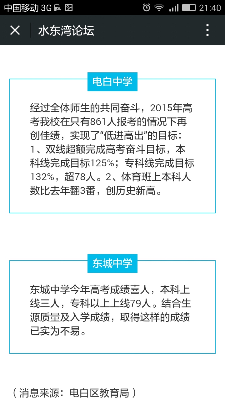 拭 拭目以待 初中三年级 注册 2012-09-23 消息 534 反馈评分 1 点数 1 2015-06-26 #57 电海、实验、水东等中学的高考成绩怎么不见公布?特别是电海,以往成绩一出开就放烟花了,今年怎么静悄悄的?
