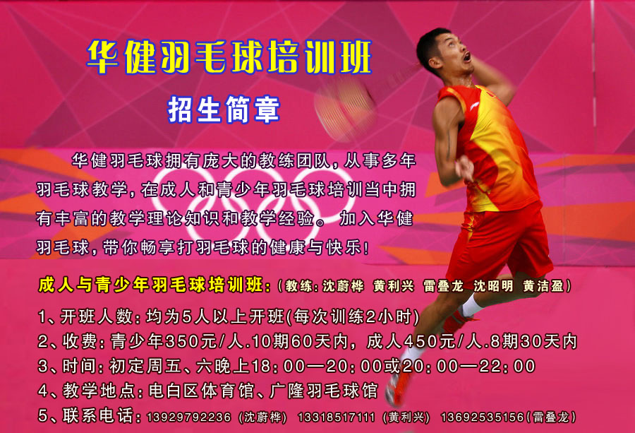H hlxgddb 学前班 注册 2007-07-09 消息 35 反馈评分 0 点数 0 2015-06-29 #1 电白华健羽毛球培训班开始啦! 开设有青少年班和成人班以及暑期班和长期班。 学打羽毛球从华健羽毛球开始! 电白华健羽毛球与您一起快乐健康成长! 附件 2015-06-25 20.05.10.jpg 70.2 KB · 查看: 141 华健培训宣传单张70张.jpg 196.4 KB · 查看: 230