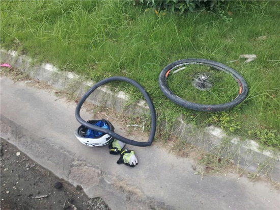 (无数次爆胎)离厦门还有47公里时,前轮爆胎了,但是小漏,就打足气继续走了,毕竟很快就到了!无奈的是,走着走着“后轮”又爆胎了,没办法,只好换上备胎了!换好胎以后,就欢快地上路了!…谁知道,不到几公里,又爆胎了(真想叫妈了)