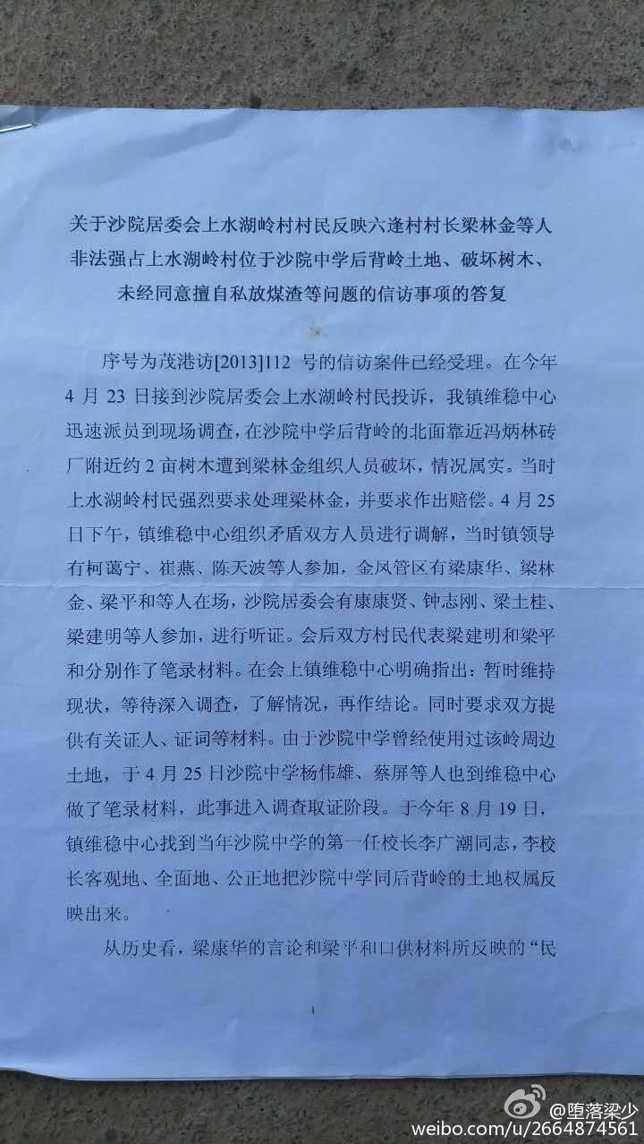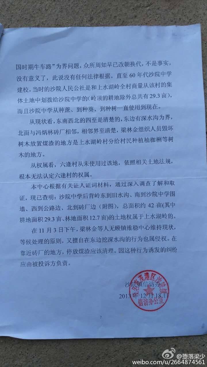 早在2013年12月份,信访办曾调解过碌逢村及水湖岭村的争纷。事隔多年的今年8月,镇政府一纸声明,否定了信访办的调解。镇政府应该为信访办的越权行为负责任并立即更正,多年后多次出现群众事件才终止,有可能导致部分法律观念淡薄的人更会选择火拼解决矛盾,而不相信政府。我们都不想看到的。