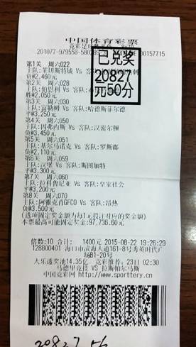 第二张竞彩票:8×70×10倍=总投入1400元,对6场奖金20827元