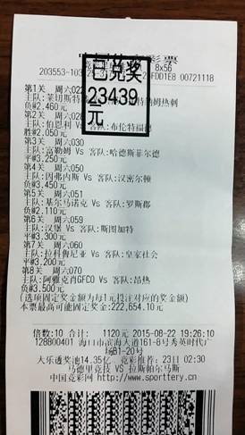 第一张竞彩票:8×56×10倍=总投入1120元,对6场奖金23439元