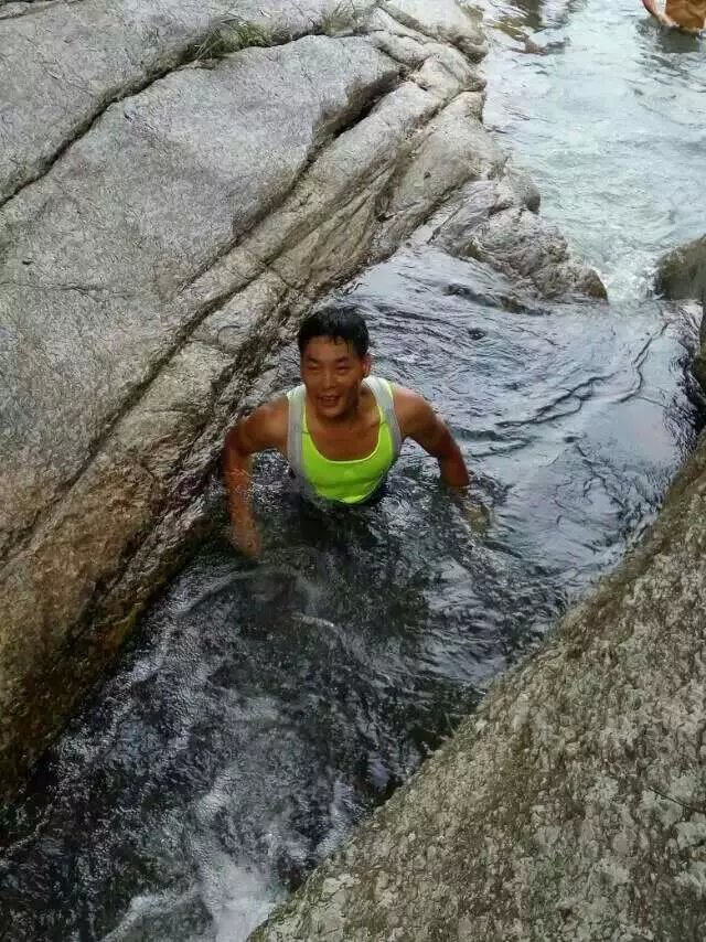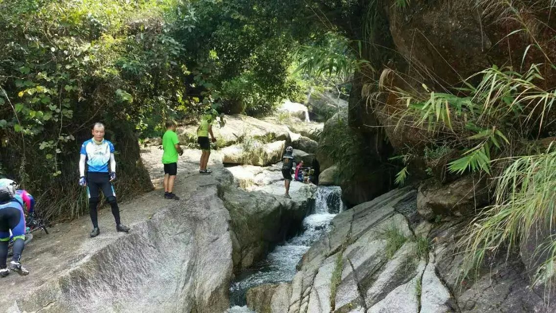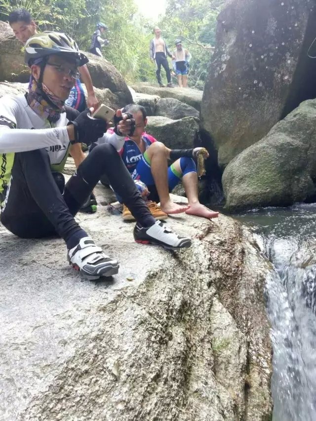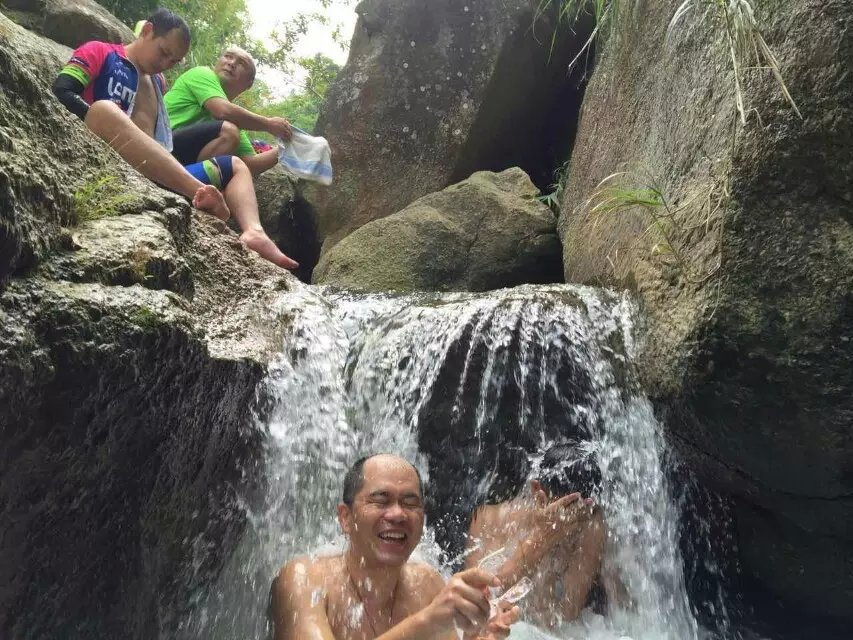 秋天,收获的季节,万物成熟,色彩斑蹋所以秋与色往往连在一起。沿途我们都深深被这秋色所感动,道路两边的稻田一地金黄,微风过处成遍的稻穗象海浪一样彼此起伏,送来阵阵谷香,面对丰收在望,农民都喜上眉梢,乐在心头。不觉间队伍到了观珠镇位于大水坡村的旱平水库,只见远处群山莽莽,无限延伸,近处水面波光粼粼,碧绿的水与小山苍翠的树相映成趣。不过最令伙伴们留恋和驻足的还是旁边的石壁潭,当聪哥、彬哥、骑兵等游泳高手见到这清澈见底,冰冷甘甜的潭水,真正做到毫不犹豫、奋不顾身跳入拥抱。看着这隐藏林木、突然而来的潭水,不禁感触良多。那从半山腰飞奔而下的泉水,毫不畏惧地向巨石冲去,发出隆隆的轰鸣声,遇到强大的阻力才极不情愿地从石隙中流出,溅起片片水花;大石上的榕树,盘根错节,不顾养分稀少,坚决无商量地把根深入到缝隙里;漆黑的花岗岩,历经千年的风化,也只是在表面留下浅浅的皱纹。还有,随处可见的水稻被坚硬的栅栏围住,以防野猪偷食破坏;路边柔弱的狗尾草,迎着秋阳骄傲地向人们展示身姿;小水库里浮游的白鸭,轻松的脸上不经意地犁出水面浅浅的波纹,映射出天上迷人的霞光,但有谁知道它在水下用红掌拼命划水呢?大自然的造化就是这样,处处充满奇迹。