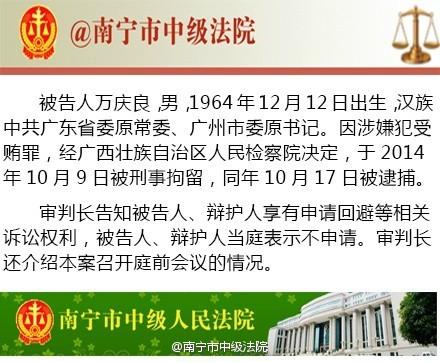 据广西壮族自治区南宁市中级人民法院官方微博@南宁市中级法院消息,广东省委原常委、广州市委原书记万庆良受贿案由广西壮族自治区南宁市中级人民法院副院长洪彪担任审判长,与审判员刘振华、韦璐明组成合议庭。2015年12月25日8时30分,审判长敲响法槌,宣布开庭
