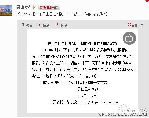 QUOTE(02届海滨 @ 2016年01月09日 Saturday, 01:21 AM) http://video.weibo.com/show?fid=1034:b9bd9...sappinstalled=0 不是人来的大冷天几个青年爆打一个童儿打完后还用绳子绑着手脚掉下水。这是人干的?希望警察把这群人捉起来,然后判刑!是电白山区农村讲涯的乡村不知道那条村那些人干的! [snapback]3787807[/snapback] 的确令人气愤,希望查出! 不知上传源头,就不要妄下判断!不要让无辜的山村躺着中枪,不像电白山区农村的!