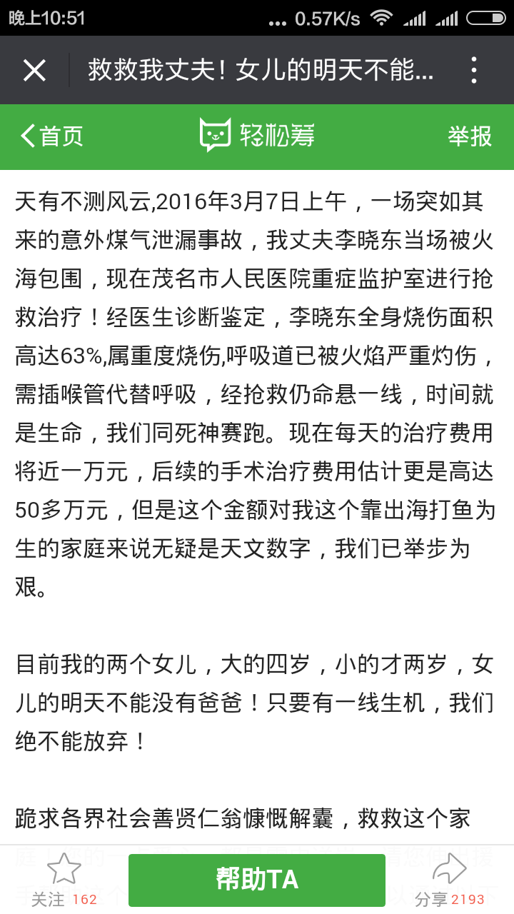 天有不测风云,2016年3月7日上午,一场突如其来的意外煤气泄漏事故,我丈夫李晓东当场被火海包围,现在茂名市人民医院重症监护室进行抢救治疗!经医生诊断鉴定,李晓东全身烧伤面积高达63%,属重度烧伤,呼吸道已被火焰严重灼伤,需插喉管代替呼吸,经抢救仍命悬一线,时间就是生命,我们同死神赛跑。现在每天的治疗费用将近一万元,后续的手术治疗费用估计更是高达50多万元,但是这个金额对我这个靠出海打鱼为生的家庭来说无疑是天文数字,我们已举步为艰。