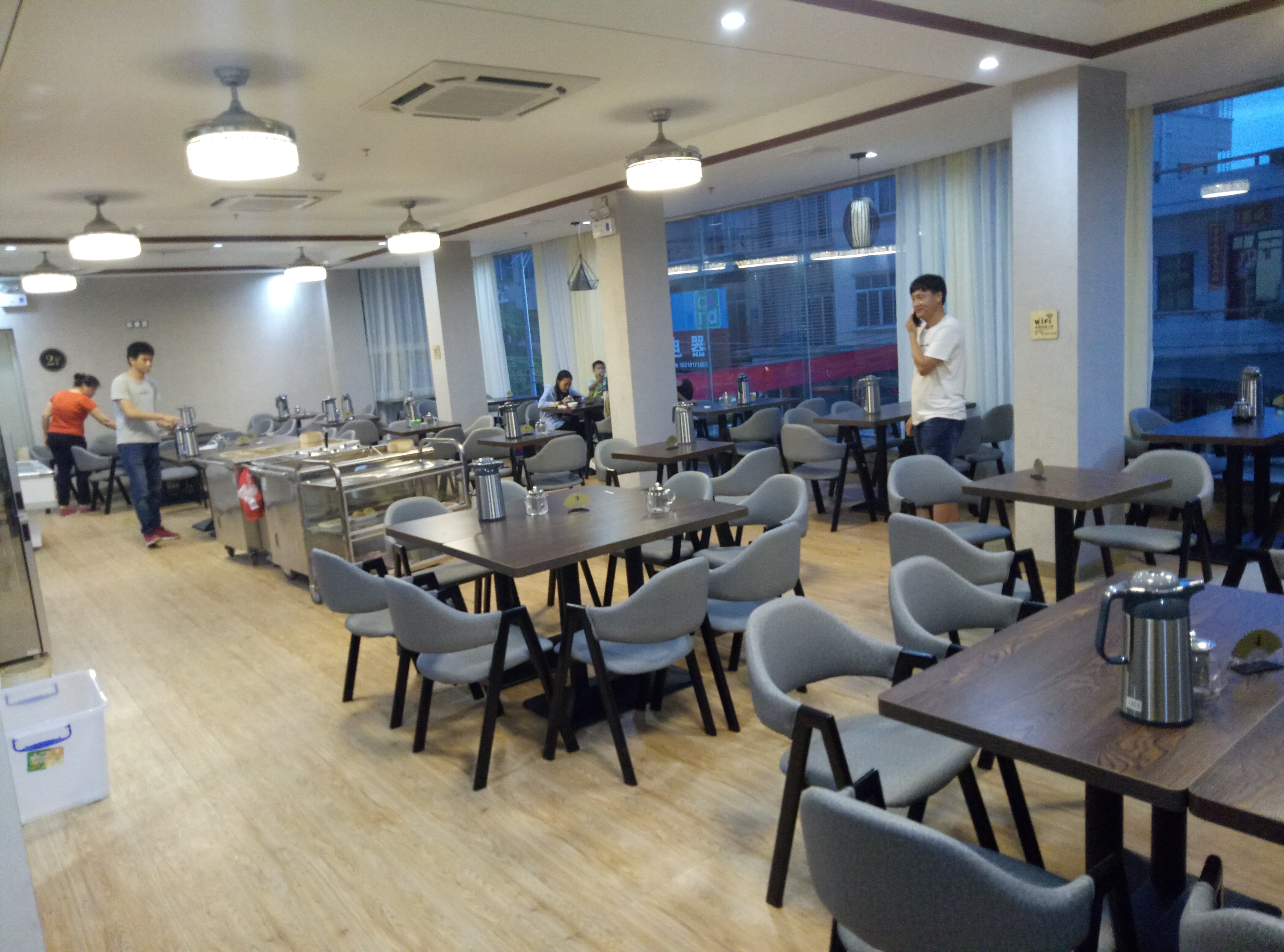 祥和酒店的喝茶地方主要是二楼大厅,既为酒店的客人提供免费早餐,也对外提供饮食服务。在这里,你可以喝茶,也可以吃饭。大厅外这里还有两个房间。旁边也有停车场。以后停车场还会扩大。