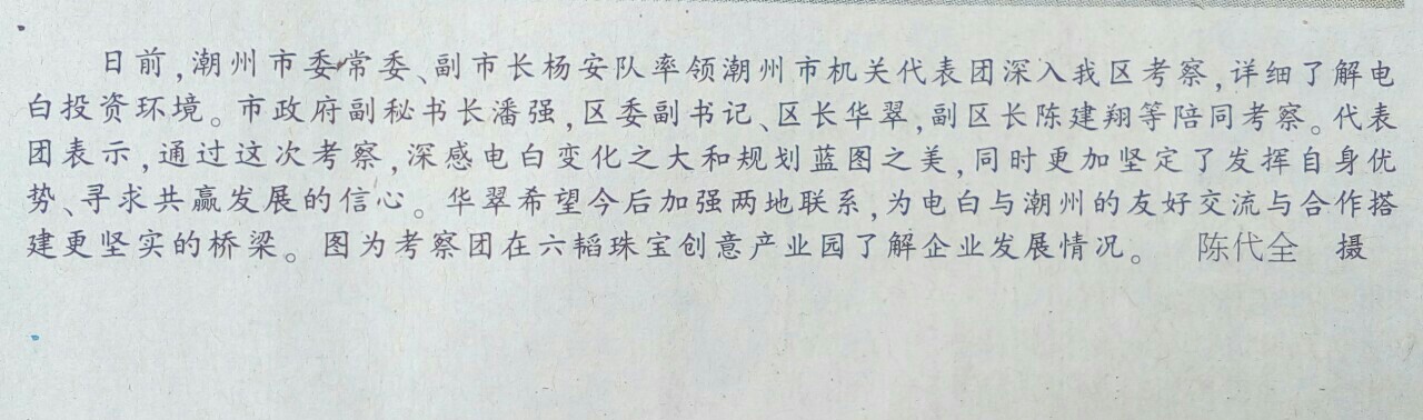 并详细了解电白投资环境。市政府副秘书长潘强,区委副书记、区长华翠,副区长陈建翔等陪同考察。代表团表示,通过这次考察,深感电白变化之大和规划蓝图之美,同时更加坚定了发挥自身优势、寻求共赢发展的信心。华翠希望今后加强两地联系,为电白与潮州的友好交流与合作搭建更坚实的桥梁!