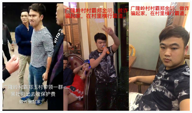 郑玉村、郑金明等人在2017年12月23日当天,拉着横幅提着锣鼓,大摇大摆出现在事件中的瑛姑食庄,几乎所有人都是举着手机拍摄,郑玉村如何用黎话秀中国粗口说唱,如果有《中国农村说唱》的比赛,绝对推荐你去参加!从郑玉村和郑玉明等人的快手页面上传的视频(酒吧小姐陪同唱K、裸露身体之类)就可以明显的看出他们是在作秀。视频里没拍到的人还有郑建国,据说这位新任村长的儿子与郑玉村、郑金明等人拉了一个私密的微信群,将每天排到的视频整理并编辑通过小号转发出去,事情发生当日,新建多个小号发布未经证实的文章,这已经犯法,显然,这件事情背后,跟新任村长也是有莫大的关系,但是让人想不通的是,村内土地所属权不明确既然是历来的事实,村长选了一任又一任,过去的村长还把村里的土地卖给不是村里面的人,现在新任村长一上任,羽毛球场事件立马发生,而村长的儿子郑建国更同时转发相关微博,并在微博上发表:“我只想拿回自己的东西……”细思极恐,是谁让郑玉村、郑金明这群流氓这么有底气来代表村民说话?新任村长是如何被选上?新任村长在整件事情中起到什么作用?