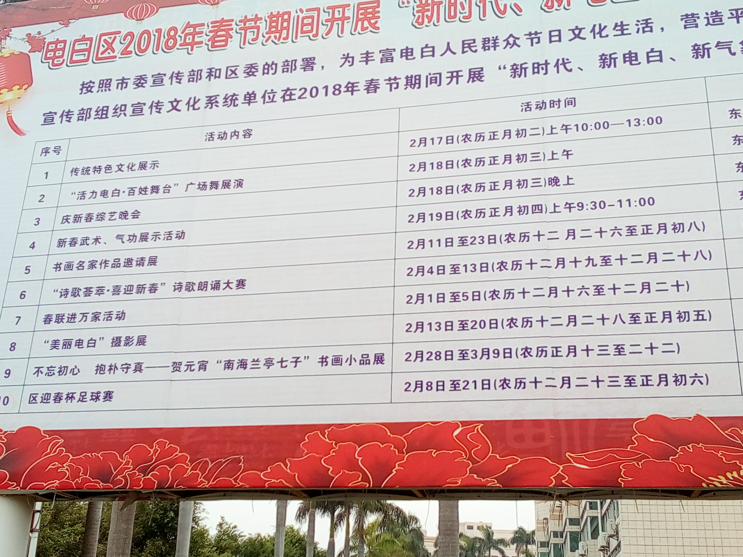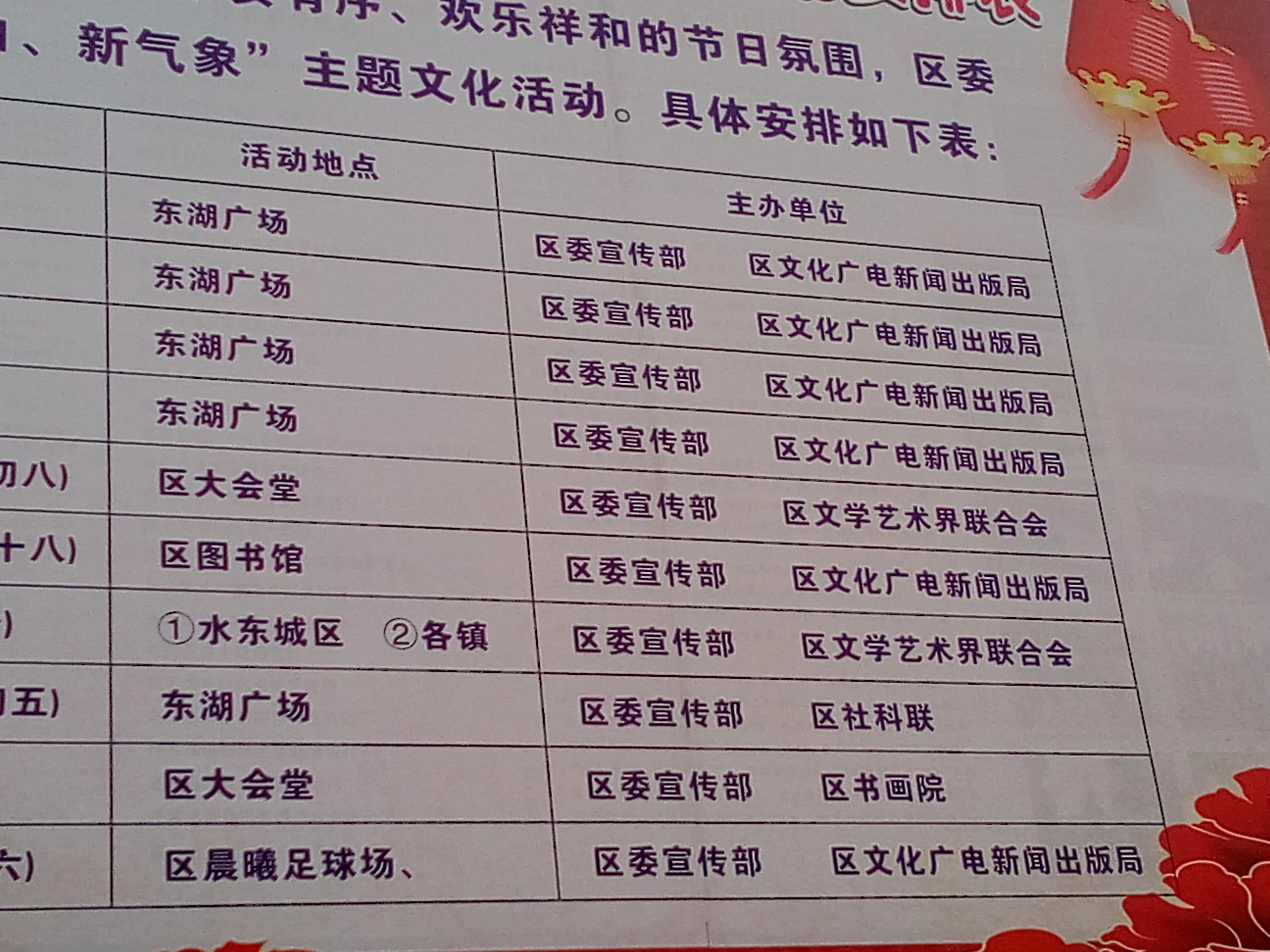 春节很快就到来了,大街小巷都挂满了喜气的灯笼,节日期间城区有什么文体活动呢?往年在东湖边都挂上大的宣传牌,告知市民春节期间有哪些节日,今年没有。难道今年啥活动都没有?