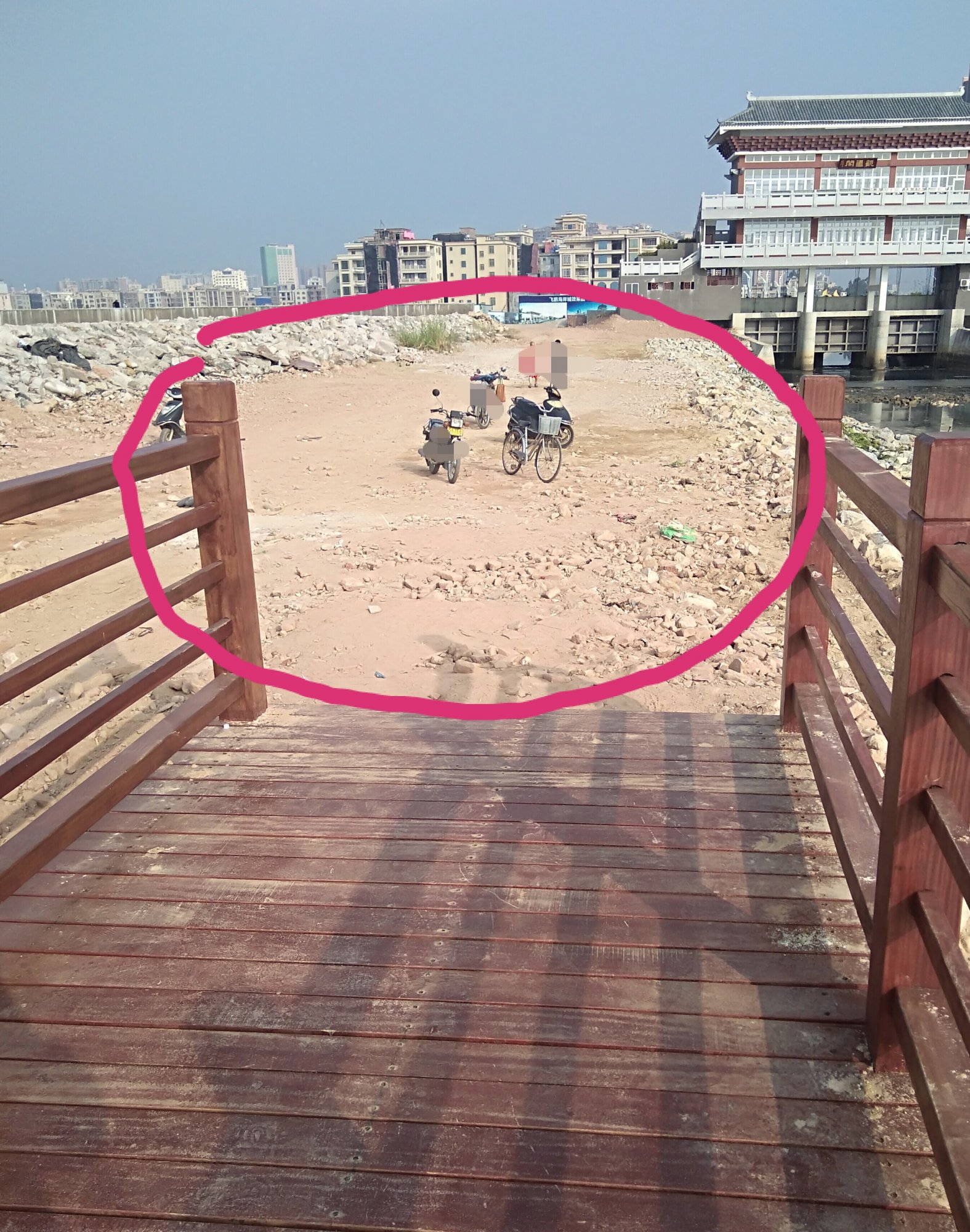 中间隔个避风港,船要出入,栈道连不到那边了。
