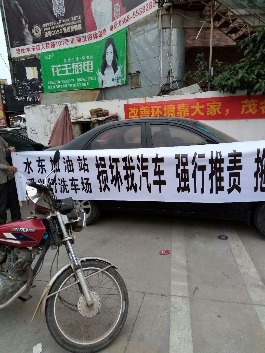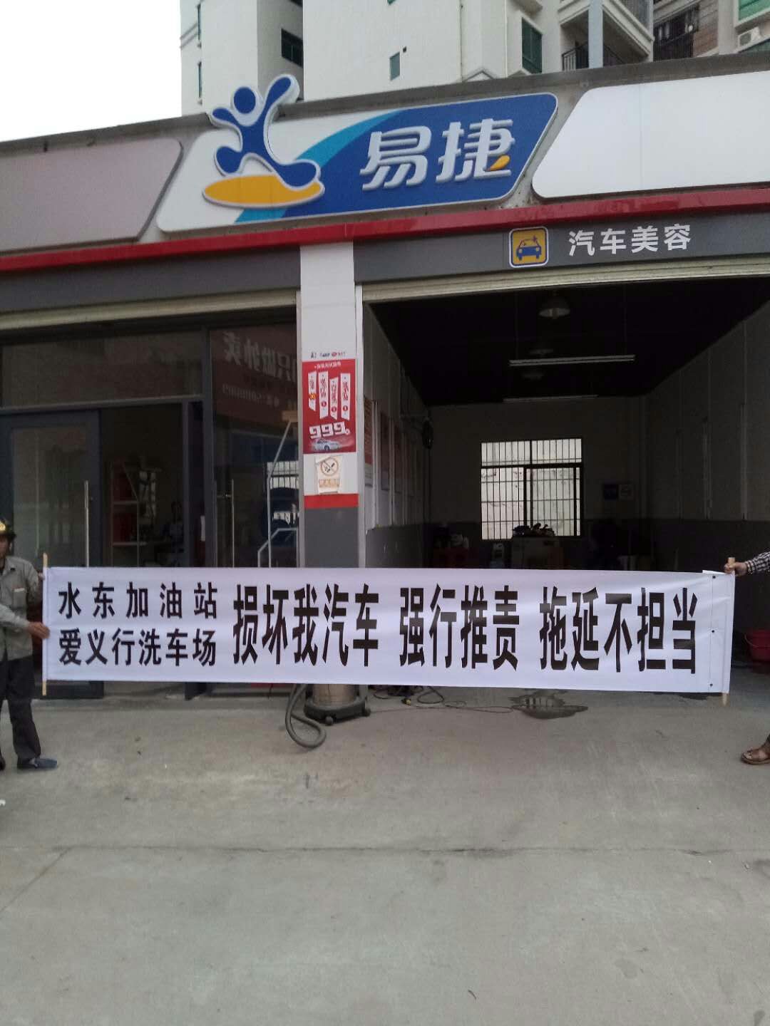 水东加油站爱义行洗车场损坏消费者汽车,抗战退伍军人集体伸张正义,替受害消费者维权!水东加油站爱义行洗车场损我汽车 强行推责 在不知情的情况下(水东消委会安排双方定于2018年4月十号协商前,在八号夜间,无经过车主同意 不知情,违法拖车。爱义行洗车场逃避责任,行为恶劣。), 强行从店内拖我车 造成我车二次受损 拖延不担当。坚决向损害消费者权益的行为宣战,绝不妥协!