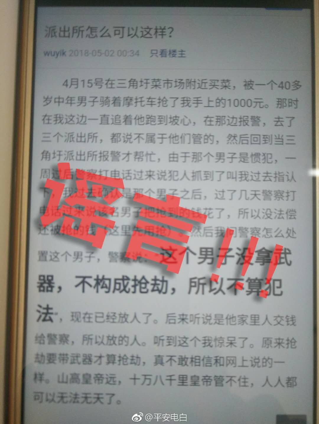 近日,茂名某论坛出现一篇题为《派出所怎么可以这样?》的网帖,发帖者在帖文中称,电白公安分局三角圩派出所在办理一宗飞车抢夺案件时,警察竟对报案人说“没拿武器,不构成抢劫,所以不算犯法”,最后还因为“他(犯罪嫌疑人)家里人交钱给警察,所以已经放人了”。