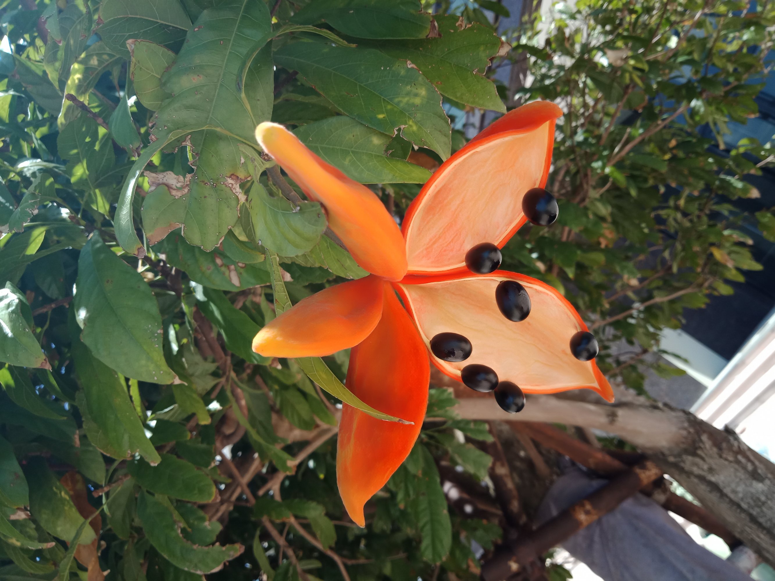 假苹婆(学名:Sterculia lanceolata Cav.):为梧桐科苹婆属常绿小乔木,苹婆会在7月时落叶,有别于秋冬的落叶,可以叫它做换叶树,由于其结果的时间与中国七姐诞辰相近,故称为七姐果、赛苹婆、鸡冠皮等。叶子呈椭圆形,先端急尖,基部钝圆,边全缘,叶柄肿胀。在露地其花期为4-5月份,在温室里3月初就有花。圆锥花序,腋生,密集且多分枝,花淡红色,萼片5枚,仅基部相连,向外开展如星状,其花为单性,雄花的雌雄蕊柄长2-3毫米,向内弯曲,花药大约10个,雌花的子房圆形,花柱弯曲。
