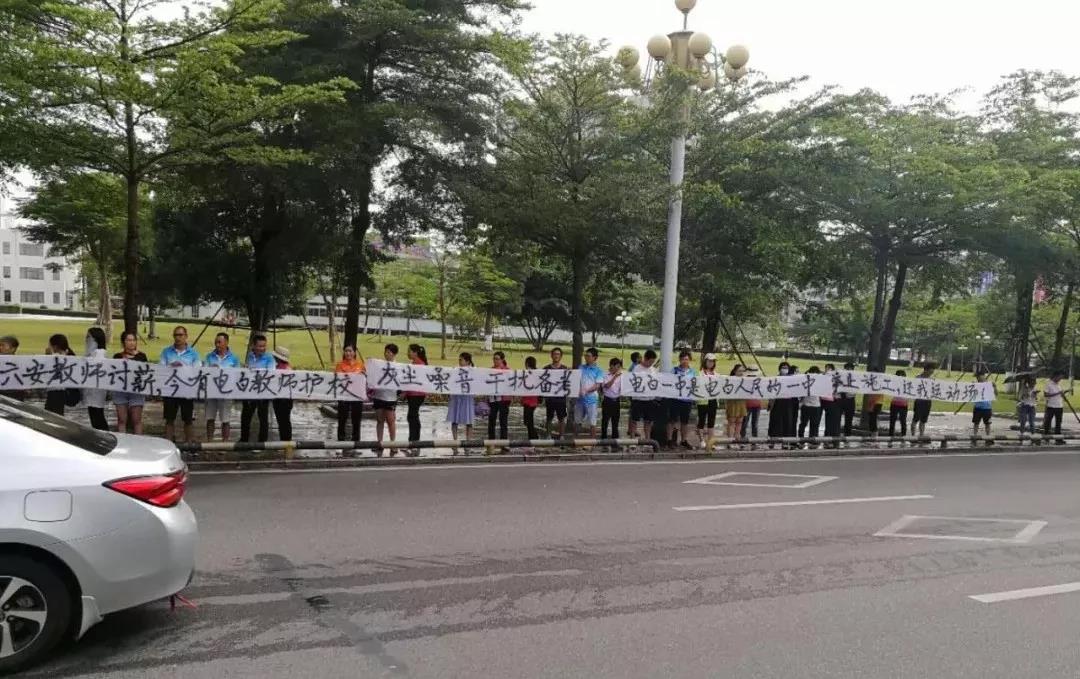 教师节前夕,电白一中的老师们,冒着烈日,走上街头,在区政府门口拉起了横幅。