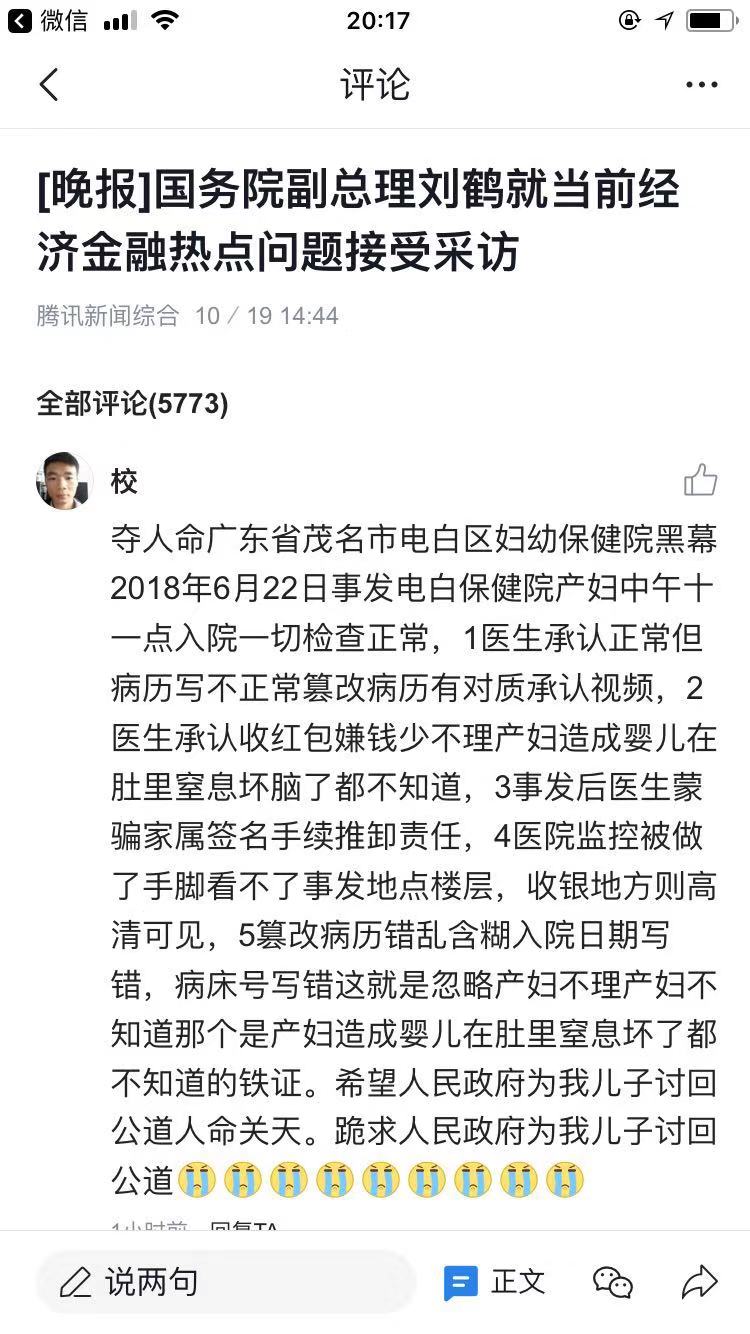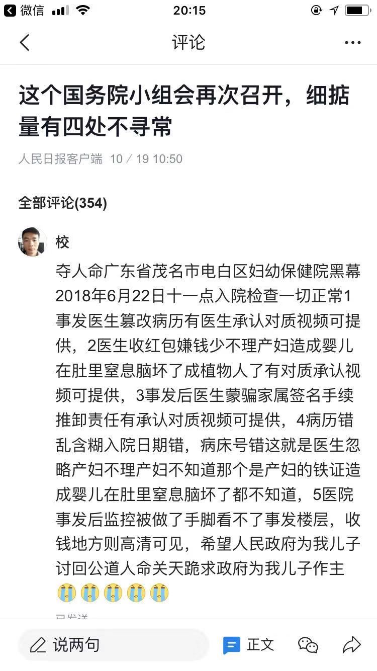夺命广东省茂名市电白区妇幼保健院黑心医生潜规则,事发2018年6月22日去电白妇幼保健院生孩子。上午11:30时检查孕妇B超,胎鉴,胎心一切正常,医生篡改病历写不正常有医生承认对质视频,病床号写错,入院日期写错,病历错乱含糊篡改病历推卸责任医生良心何在?医徳何在?这就是医生忽略产妇不理产妇不知道那个是产妇捏造的假病历,造成婴儿死亡的直接铁证,一日加一晚上只给产妇做一次胎鉴三次胎心监擦造成婴儿在肚里窒息坏脑了都不知道的致人命过失,有涉事医生承认收300元红包嫌钱少不理产妇的承认对质视频造成婴儿在肚里窒息脑坏了死亡了,有当晚事发后医生蒙骗威逼家属签名手续的对质视频医生好推卸责任,事发后电白保健院监控被做了手脚看不了事发楼层,收钱一楼则是高清可见,电白卫生局包庇电白保健院及医生欺上满下扭曲事实颠倒黑白回复国家信访局,患方证据一点也不敢提把政害民有冤难伸,冒充家属签名,不作为帮保健院推责任给家属,以上所讲全部属实样样有证据可提供铁证,希望大家帮我多多转发!!!好人有好报。今年年头段时间又接生接坏人家一对双包胎走了才赔偿人家七万元,前些日子又医坏人家一个孩子,现在又接坏一个孩子死亡了真真实实的事,希望社会各界关注转发电话15119705797