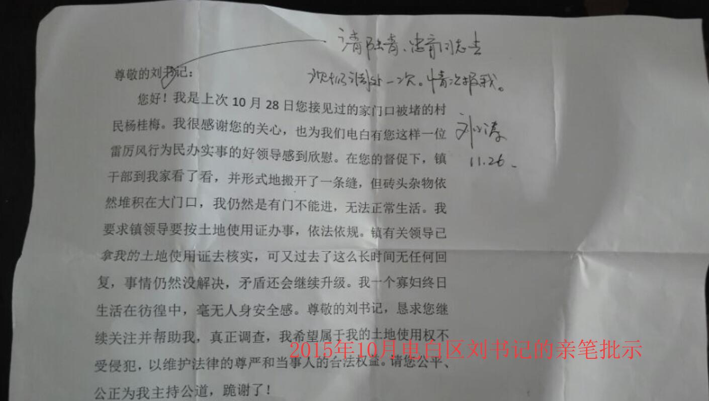 五年来,我只诉求负责这个事情的镇领导把我两家人土地证红线里面的土地做出明确的界限,子孙后代不再有矛盾纠纷。这五年来,我多次向镇政府反映,但均未得到任何有意义的调节及公开处理此事的答复。我深深恳请各级政府及社会各界人士在百忙之中能关注——一个诉求公平公正,维护正当权益免遭侵害的事实;伸张正义,给一个正在蒙受苦难的老百姓做主,还我公道!!跪谢跪谢