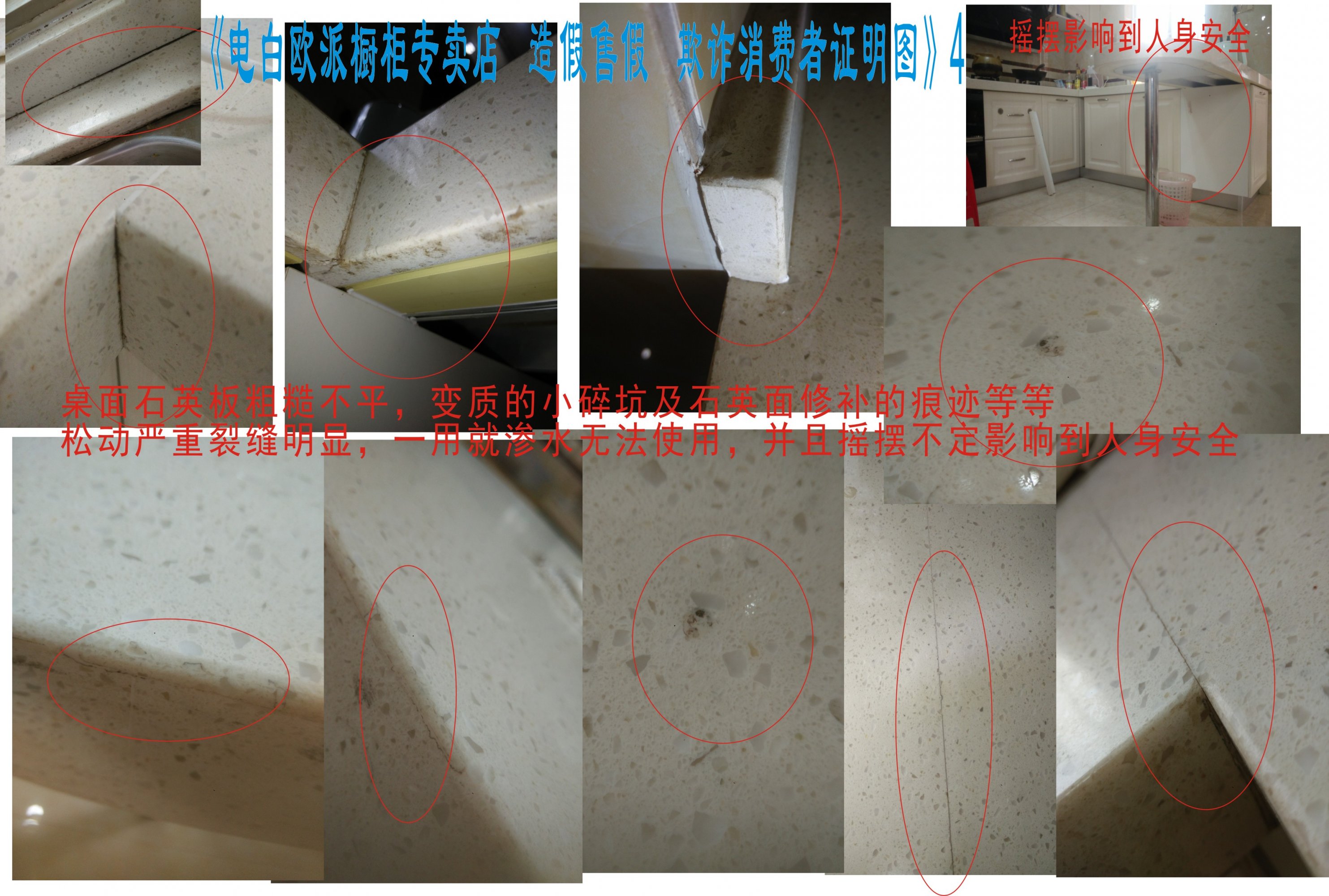 欧派定制的橱柜,并没有售前所说的欧派品牌进口五金材料,而是使用了别的五金材料,部分五金已经生锈脱落,欺诈以假充真。完工后并没有对我的厨房定制进行验收,出具合格证,以及相关的检查报告环保等文件,部分板材没有压边封边,板材类的棵粒都是可以看的到,板材切个边弯曲,柜台开门吱吱制作响,螺丝孔随处可见,板材表面弯曲变形,裂缝可以进小强,水龙头瑕疵深划痕,橱柜石英板粗糙不平有小碎坑等等,整个外观无法表现出高贵的费用定制的欧派橱柜,并且使用起来也非常的像伪劣产品,本人严重怀疑是否欧派正品,严重怀疑定制产品的合格性。严重欺诈我售前说的高端欧派,因为不联系开放式厨房,所以对高端要求很高但是你做出的效果比夫妻间还要差!欧派橱柜欺骗我以次冲好,以假乱真!