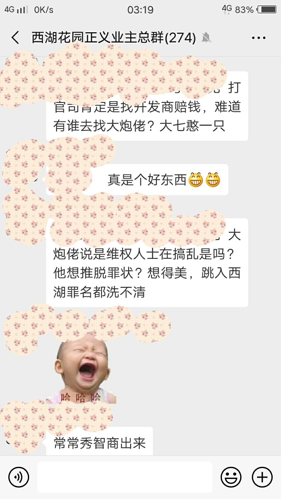 二、西湖花园有多丑?花园丑,人格更丑!电白二建打造如此垃圾精品,延迟一年半交楼,不但不诚心向业主表达歉意,而且还妄想通过看门狗诱骗、分化、压制业主,达到强行交楼目的。不少正义业主强烈维权,冒牌业主群群主潘小良(4栋1704房、自封龙哥,实是大憨一只,被业主称为汉奸)充当看门狗,用尽丑陋招数试图帮开发商瓦解业主维权行动,他尤其喜欢欺负女人,可以骂到你连妈都不认得。[捂脸]