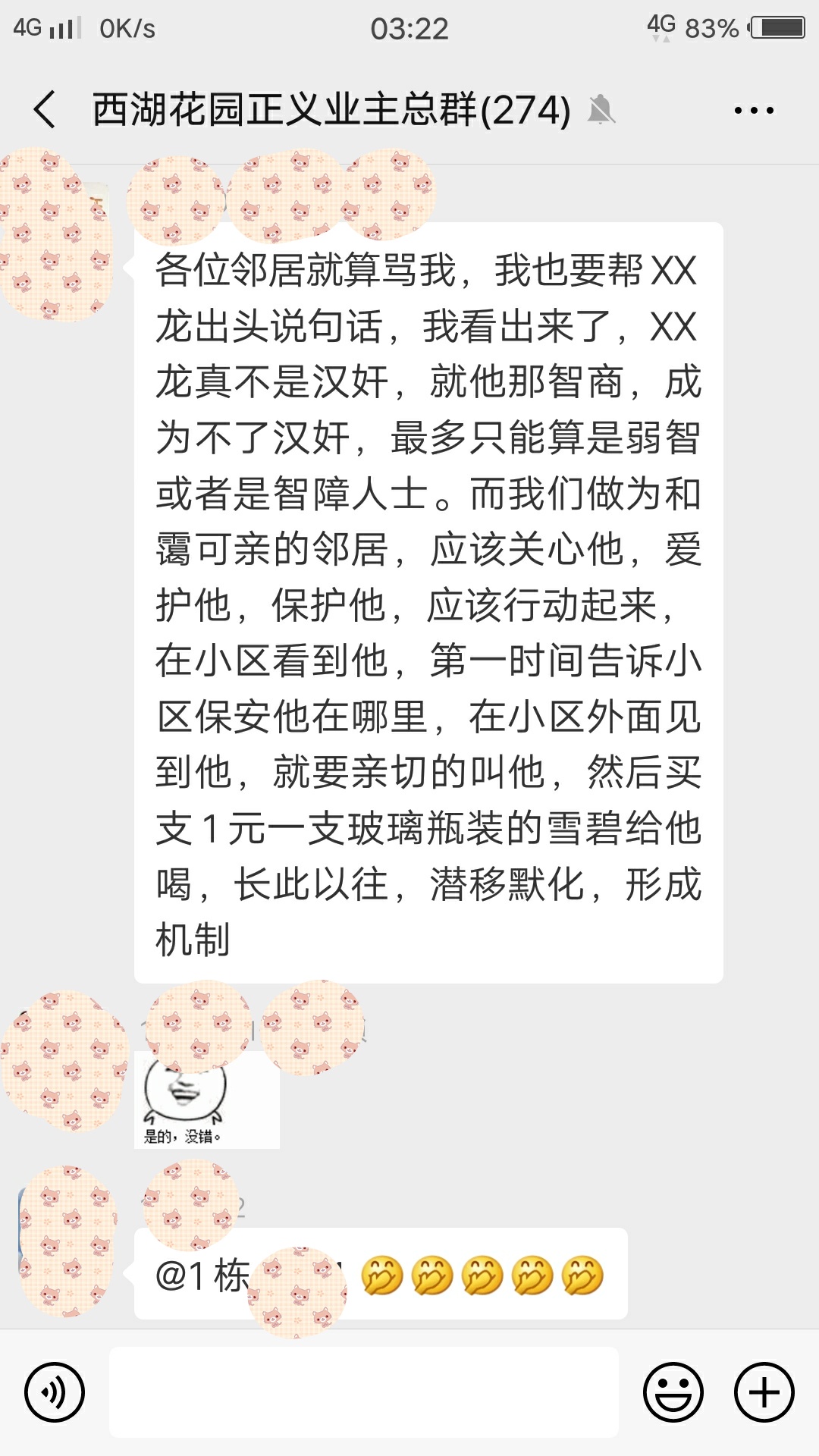 潘大憨自巴结大老板后便得意忘形,依附大老板干爹撑腰,动不动就以一句名言“我怀疑你不是业主”把业主踢出群,并专挑女人和上了年纪的欺负,以此塑造“英雄”形象[捂脸]浏览附件325226 浏览附件325227浏览附件325228浏览附件325229