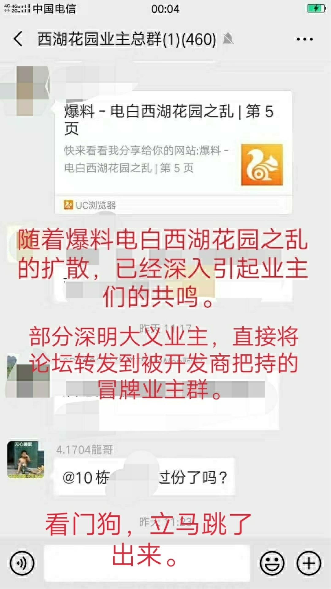 据西湖角报社前方记者报道:4栋17×4房潘大憨,逼于主上多方面的压力,又成为主上的看门狗,又溜回当冒牌业主群的群主。其中必有大文章,具体报道,等前方记者采记完毕,再呈献给广大关心西湖之乱的看客。