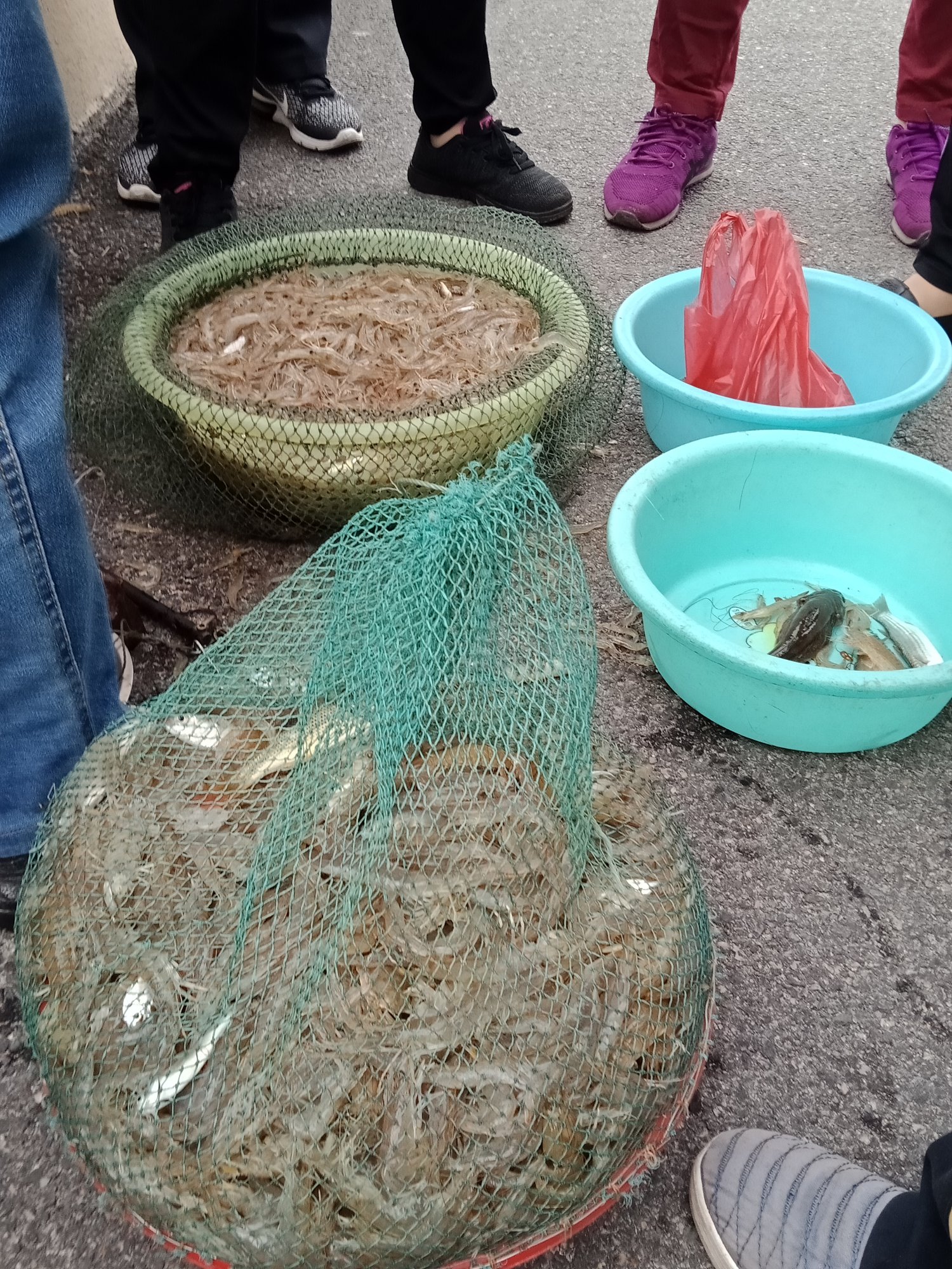 向着油地公园那边跑去,半路,见有好多晨跑运者围住~好奇走近一看,听闻是趁海人,上来这,准备将远海收获送去市场内贩或买?在这就有好些人帮衬了~听闻(有录到音频),单独虾或全部杂物都三十块钱一斤(还说市场要买三十伍块钱一斤,不知有骗人婆?),并说只收现金,没手机也不懂收微信付款~不过也有好多人买~