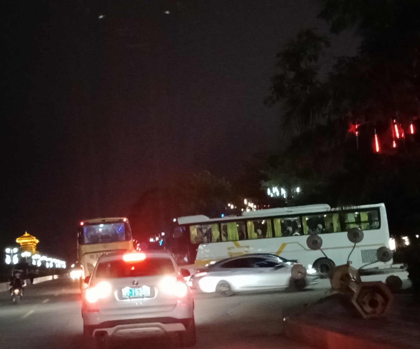 今晚星期五7点几钟,又想去东湖吸吸7点半钟的光影秀(还有场8点半的.还有明晚星期六的两场),驾摩出时有微微雾雨,人群虽少许多(可能是有雾雨吧?),但徒步群众都有好些(有些拿了雨伞),见还没开始,就驾摩过栈道那边吸吸,忽见有几辆游巴从海滨大桥那边方向开来,并停靠在亲水平台这边停下,并从游巴上走下尊贵的远方游客~